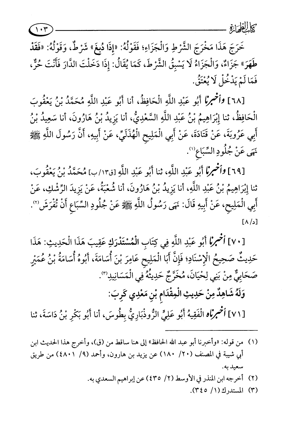 [68] وأخبرنا أَبُو عَبْدِ اللَّهِ الْحَافِظُ، أنا أَبُو عَبْدِ اللَّهِ مُحَمَّدُ بْنُ يَعْقُوبَ الْحَافِظُ، ثنا إِبْرَاهِيمُ بْنُ عَبْدِ اللَّهِ السَّعْدِيُّ، أنا يَزِيدُ بْنُ هَارُونَ، أنا سَعِيدُ بْنُ أَبِي عَرُوبَةَ، عَنْ قَتَادَةَ، عَنْ أَبِي الْمَلِيحِ الْهُذَلَيِّ، عَنْ أَبِيهِ، أَنَّ رَسولَ اللَّهِ - صلى الله عليه وسلم - نَهَى عَنْ جُلُودِ السِّبَاعِ (¬1).