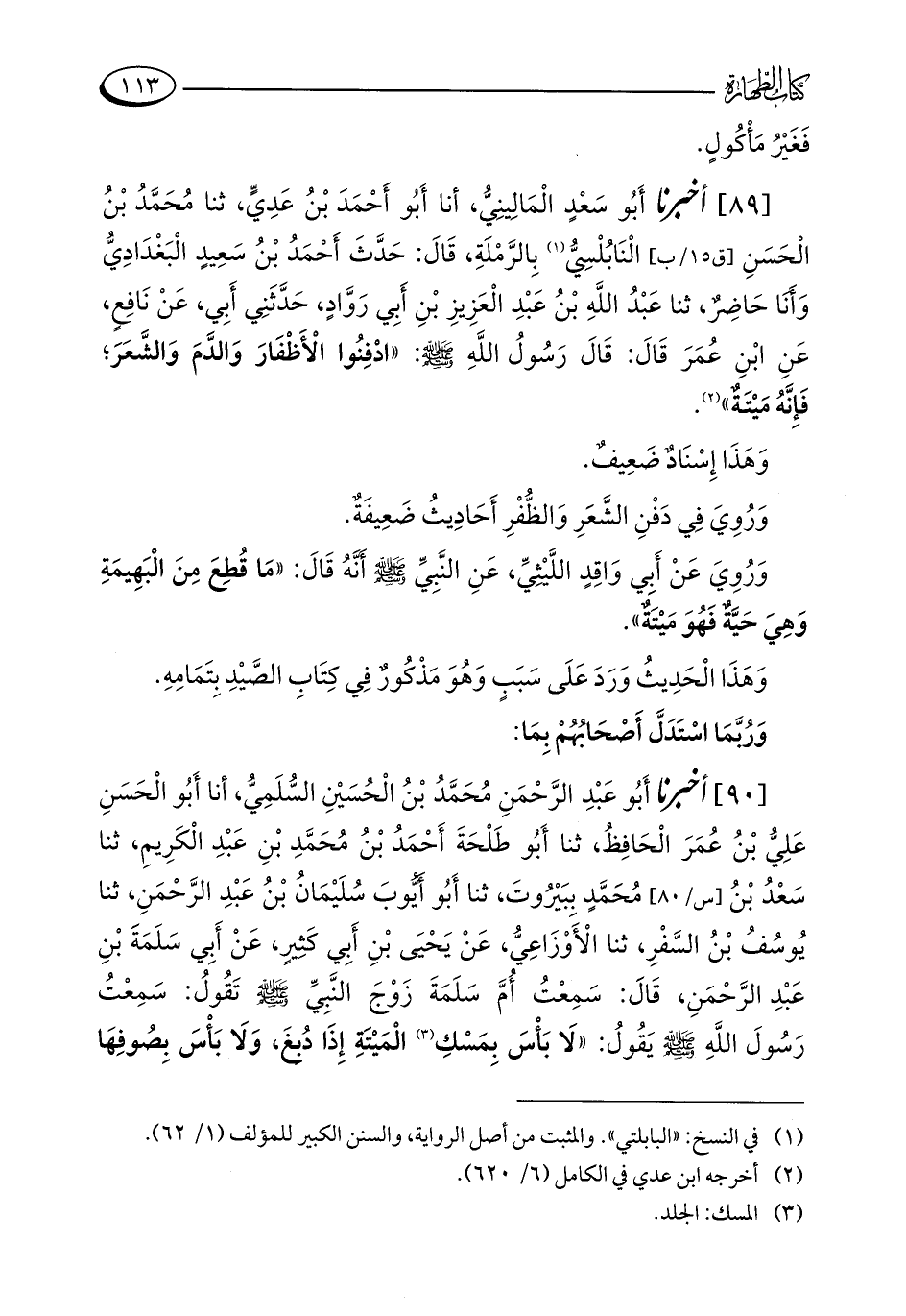 [89] أخبرنا أَبُو سَعْدٍ الْمَالِينِيُّ، أنا أَبُو أَحْمَدَ بْنُ عَدِيٍّ، ثنا مُحَمَّدُ بْنُ الْحَسَنِ الْنَابُلْسِيُّ (¬1) بِالرَّمْلَةِ، قَالَ: حَدَّثَ أَحْمَدُ بْنُ سَعِيدٍ الْبَغْدَادِيُّ وَأَنَا حَاضِرٌ، ثنا عَبْدُ اللَّهِ بْنُ عَبْدِ الْعَزِيزِ بْنِ أَبِي رَوَّادٍ، حَدَّثَنِي أَبِي، عَنْ نَافِعٍ، عَنِ ابْنِ عُمَرَ قَالَ: قَالَ رَسُولُ اللَّهِ - صلى الله عليه وسلم -: "ادْفِنُوا الْأَظْفَارَ وَالدَّمَ وَالشَّعَرَ؛ فَإِنَّهُ مَيْتَةٌ" (¬2).