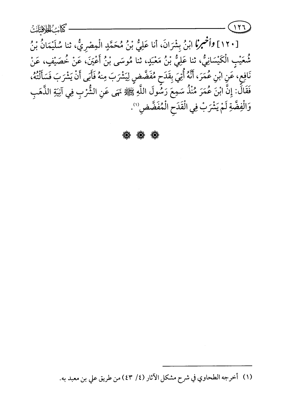 [120] أخبرنا ابْنُ بِشْرَانَ، أنا عَلِيُّ بْنُ مُحَمَّدٍ الْمِصْرِيُّ، ثنا سُلَيْمَانُ بْنُ شُعَيْبٍ الْكَيْسَانِيُّ، ثنا عَلِيُّ بْنُ مَعْبَدٍ، ثنا مُوسَى بْنُ أَعْيَنَ، عَنْ خُصَيفٍ، عَنْ نَافِعٍ، عَنِ ابْنِ عُمَرَ، أَنَّهُ أُتِيَ بِقَدَحٍ مُفَضَّضٍ لِيَشْرَبَ مِنهُ فَأَبَى أَنْ يَشْرَبَ فَسَأَلْتُهُ، فَقَالَ: إِنَّ ابْنَ عُمَرَ مُنْذُ سَمِعَ رَسُولَ اللَّهِ - صلى الله عليه وسلم - نَهَى عَنِ الشُّرْبِ فِي آنِيَةِ الذَّهَبِ وَالْفِضَّةِ لَمْ يَشْرَبْ فِي الْقَدَحِ الْمُفَضَّضِ (¬1).