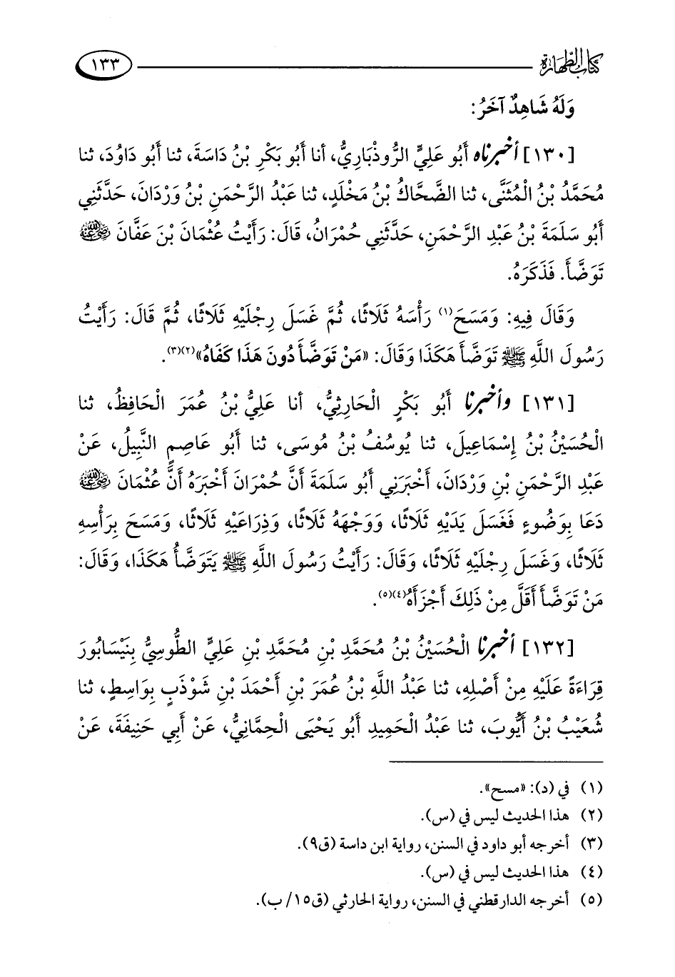 [131] وأخبرنا أَبُو بَكْرٍ الْحَارِثِيُّ، أنا عَلِيُّ بْنُ عُمَرَ الْحَافِظُ، ثنا الْحُسَيْنُ بْنُ إِسْمَاعِيلَ، ثنا يُوسُفُ بْنُ مُوسَى، ثنا أَبُو عَاصِمٍ النَّبِيلُ، عَنْ عَبْدِ الرَّحْمَنِ بْنِ وَرْدَانَ، أَخْبَرَنِي أَبُو سَلَمَةَ أَنَّ حُمْرَانَ أَخْبَرَهُ أَنَّ عُثْمَانَ - رضي الله عنه - دَعَا بِوَضُوءٍ فَغَسَلَ يَدَيْهِ ثَلَاثًا، وَوَجْهَهُ ثَلَاثًا، وَذِرَاعَيْهِ ثَلَاثًا، وَمَسَحَ بِرَأْسِهِ ثَلَاثًا، وَغَسَلَ رِجْلَيْهِ ثَلَاثًا، وَقَالَ: رَأَيْتُ رَسُولَ اللَّهِ - صلى الله عليه وسلم - يَتَوَضَّأُ هَكَذَا، وَقَالَ: مَنْ تَوَضَّأَ أَقَلَّ مِنْ ذَلِكَ أَجْزَأَهُ (¬4) (¬5).