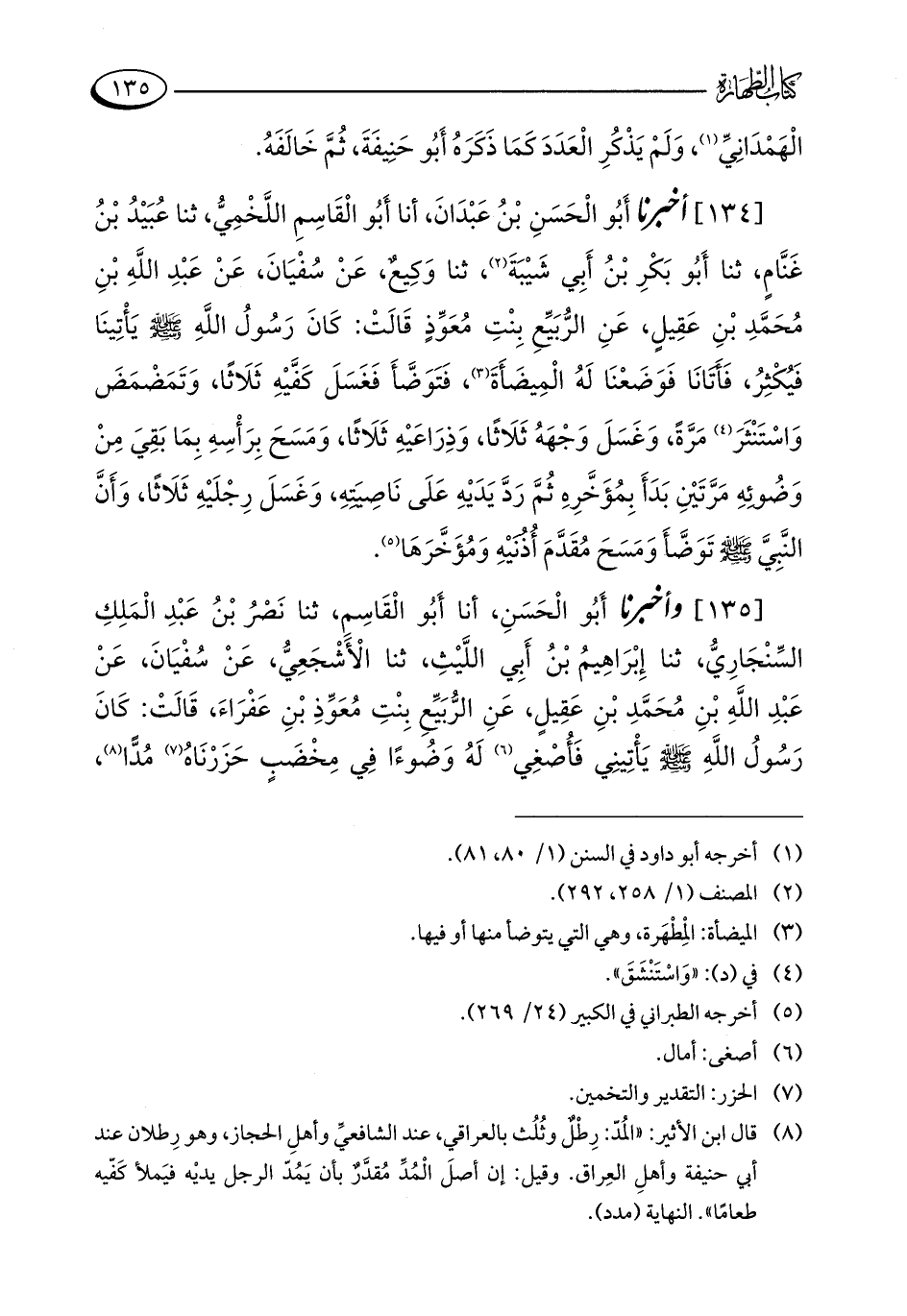 [135] وأخبرنا أَبُو الْحَسَنِ، أنا أَبُو الْقَاسِمِ، ثنا نَصْرُ بْنُ عَبْدِ الْمَلِكِ السِّنْجَارِيُّ، ثنا إِبْرَاهِيمُ بْنُ أَبِي اللَّيْثِ، ثنا الْأَشْجَعِيُّ، عَنْ سُفْيَانَ، عَنْ عَبْدِ اللَّهِ بْنِ مُحَمَّدِ بْنِ عَقِيلٍ، عَنِ الرُّبَيِّعِ بِنْتِ مُعَوِّذِ بْنِ عَفْرَاءَ، قَالَتْ: كَانَ رَسُولُ اللَّهِ - صلى الله عليه وسلم - يَأْتِينِي فَأُصْغِي (¬6) لَهُ وَضُوءًا فِي مِخْضَبٍ حَزَرْنَاهُ (¬7) مُدًّا (¬8)،