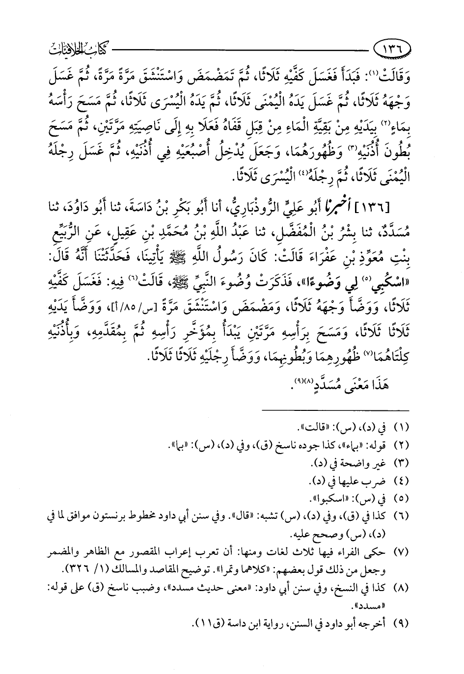 [136] أخبرنا أَبُو عَلِيٍّ الرُّوذْبَارِيُّ، أنا أَبُو بَكْرِ بْنُ دَاسَةَ، ثنا أَبُو دَاوُدَ، ثنا مُسَدَّدٌ، ثنا بِشْرُ بْنُ الْمُفَضَّلِ، ثنا عَبْدُ اللَّهِ بْنُ مُحَمَّدِ بْنِ عَقِيلٍ، عَنِ الرُّبَيِّعِ بِنْتِ مُعَوِّذِ بْنِ عَفْرَاءَ قَالَتْ: كَانَ رَسُولُ اللَّهِ - صلى الله عليه وسلم - يأْتِينَا، فَحَدَّثَتْنَا أَنَّهُ قَالَ: "اسْكُبِي (¬5) لِي وَضُوءًا"، فَذَكَرَتْ وُضُوءَ النَّبِيِّ - صلى الله عليه وسلم -، قَالَتْ (¬6) فِيهِ: فَغَسَلَ كَفَّيْهِ ثَلَاثًا، وَوَضَّأَ وَجْهَهُ ثَلَاثًا، وَمَضْمَضَ وَاسْتَنْشَقَ مَرَّةً، وَوَضَّأَ يَدَيْهِ ثَلَاثًا ثَلَاثًا، وَمَسَحَ بِرَأْسِهِ مَرَّتَيْنِ يَبْدَأُ بِمُؤَخَّرِ رَأْسِهِ ثُمَّ بِمُقَدَّمِهِ، وَبِأُذُنِيْهِ كِلْتَاهُمَا (¬7) ظُهُورِهِمَا وَبُطُونِهِمَا، وَوَضَّأَ رِجْلَيْهِ ثَلَاثًا ثَلَاثًا.