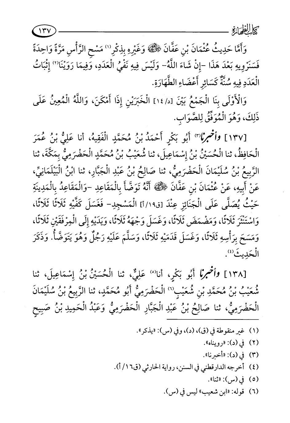 [137] وأخبرنا (¬3) أَبُو بَكْرٍ أَحْمَدُ بْنُ مُحَمَّدٍ الْفَقِيهُ، أنا عَلِيُّ بْنُ عُمَرَ الْحَافِظُ، ثنا الْحُسَيْنُ بْنُ إِسْمَاعِيلَ، ثنا شُعَيْبُ بْنُ مُحَمَّدٍ الْحَضْرَمِيُّ بِمَكَّةَ، ثنا الرَّبِيعُ بْنُ سُلَيْمَانَ الْحَضْرَمِيُّ، ثنا صَالِحُ بْنُ عَبْدِ الْجَبَّارِ، ثنا ابْنُ الْبَيْلَمَانِيِّ، عَنْ أَبِيهِ، عَنْ عُثْمَانَ بْنِ عَفَّانَ - رضي الله عنه - أَنَّهُ تَوَضَّأَ بِالْمَقَاعِدِ - وَالْمَقَاعِدُ بِالْمَدِينَةِ حَيْثُ يُصَلَّى عَلَى الْجَنَائِزِ عِنْدَ الْمَسْجِدِ - فَغَسَلَ كَفَّيْهِ ثَلَاثًا ثَلَاثًا، وَاسْتَنْثَرَ ثَلَاثًا، وَمَضْمَضَ ثَلَاثًا، وَغَسَلَ وَجْهَهُ ثَلَاثًا، وَيَدَيْهِ إِلَى الْمِرْفَقَيْنِ ثَلَاثًا، وَمَسَحَ بِرَأْسِهِ ثَلَاثًا، وَغَسَلَ قَدَمَيْهِ ثَلَاثًا، وَسَلَّمَ عَلَيْهِ رَجُلٌ وَهُوَ يَتَوَضَّأُ. وَذَكَرَ الْحَدِيثَ (¬4).