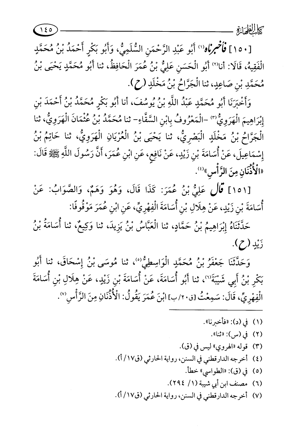وَأَخْبَرَنَا أَبُو مُحَمَّدٍ عَبْدُ اللَّهِ بْنُ يُوسُفَ، أنا أَبُو بَكْرٍ مُحَمَّدُ بْنُ أَحْمَدَ بْنِ إِبْرَاهِيمَ الْهَرَوِيُّ (¬3) - الْمَعْرُوفُ بِابْنِ السَّقَّاءِ - ثنا مُحَمَّدُ بْنُ عُثْمَانَ الْهَرَوِيُّ، ثنا الْجَرَّاحُ بْنُ مَخْلَدٍ الْبَصْرِيُّ، ثنا يَحْيَى بْنُ الْعُرْيَانِ الْهَرَوِيُّ، ثنا حَاتِمُ بْنُ إِسْمَاعِيلَ، عَنْ أُسَامَةَ بْنِ زَيْدٍ، عَنْ نَافِعٍ، عَنِ ابْنِ عُمَرَ، أَنَّ رَسُولَ اللَّهِ - صلى الله عليه وسلم - قَالَ: "الْأُذُنَانِ مِنَ الرَّأْسِ" (¬4).