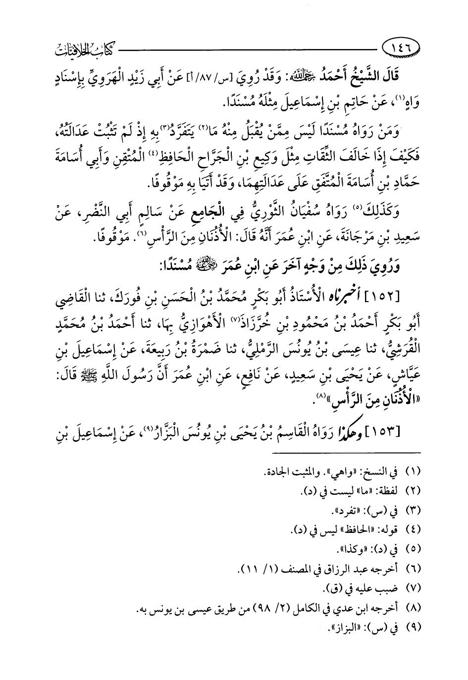 قَالَ الشَّيْخُ أَحْمَدُ - رحمه الله -: وَقَدْ رُوِيَ عَنْ أَبِي زَيْدٍ الْهَرَوِيِّ بِإِسْنَادٍ وَاهٍ (¬1)، عَنْ حَاتِمِ بْنِ إِسْمَاعِيلَ مِثْلَهُ مُسْنَدًا.