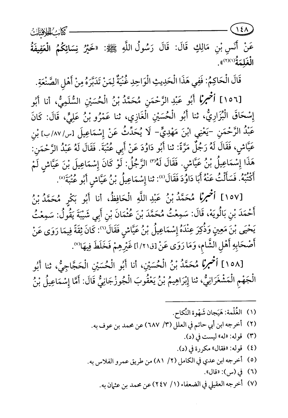 [156] أخبرنا أَبُو عَبْدِ الرَّحْمَنِ مُحَمَّدُ بْنُ الْحُسَيْنِ السُّلَمِيُّ، أنا أَبُو إِسْحَاقَ الْبُزَارِيُّ، ثنا أَبُو الْحُسَيْنِ الْغَازِي، ثنا عَمْرُو بْنُ عَلِيٍّ، قَالَ: كَانَ عَبْدُ الرَّحْمَنِ - يَعْنِي ابْنَ مَهْدِيٍّ - لَا يُحَدِّثُ عَنْ إِسْمَاعِيلَ بْنِ عَيَّاشٍ، فَقَالَ لَهُ رَجُلٌ مَرَّةً: ثنا أَبُو دَاوُدَ عَنْ أَبِي عُتْبَةَ. فَقَالَ لَهُ عَبْدُ الرَّحْمَنِ: هَذَا إِسْمَاعِيلُ بْنُ عَيَّاشٍ. فَقَالَ لَهُ (¬3) الرَّجُلُ: لَوْ كَانَ إِسْمَاعِيلَ بْنَ عَيَّاشٍ لَمْ أَكْتُبْهُ. فَسَأَلْتُ عَنْهُ أَبَا دَاوُدَ فَقَالَ (¬4): ثنا إِسْمَاعِيلُ بْنُ عَيَّاشٍ أَبُو عُتْبَةَ (¬5).