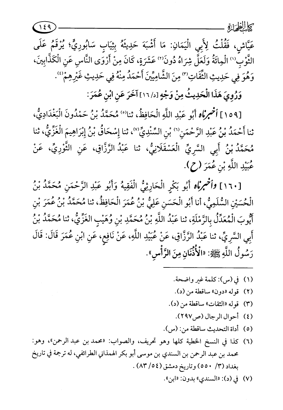 [160] وأخبرناه أَبُو بَكْرٍ الْحَارِثِيِّ الْفَقِيهُ وَأَبُو عَبْدِ الرَّحْمَنِ مُحَمَّدُ بْنُ الْحُسَيْنِ السُّلَمِيِّ، أنا أَبُو الْحَسَنِ عَلِيُّ بْنُ عُمَرَ الْحَافِظُ، ثنا مُحَمَّدُ بْنُ عُمَرَ بْنِ أَيُّوبَ المُعَدِّلُ بِالرَّمْلةِ، ثنا عَبْدُ اللَّهِ بْنُ مُحَمَّدِ بنِ وُهَيْبٍ الغَزِّيُّ، ثنا مُحَمَّدُ بْنِ أَبِي السَّرِيِّ، ثنا عَبْدُ الرَّزَّاقِ، عَنْ عُبَيْدِ اللَّهِ، عَنْ نَافِعٍ، عَنِ ابْنِ عُمَرَ قَالَ: قَالَ رَسُولُ اللَّهِ - صلى الله عليه وسلم -: "الْأُذُنَانِ مِنَ الرَّأْسِ".