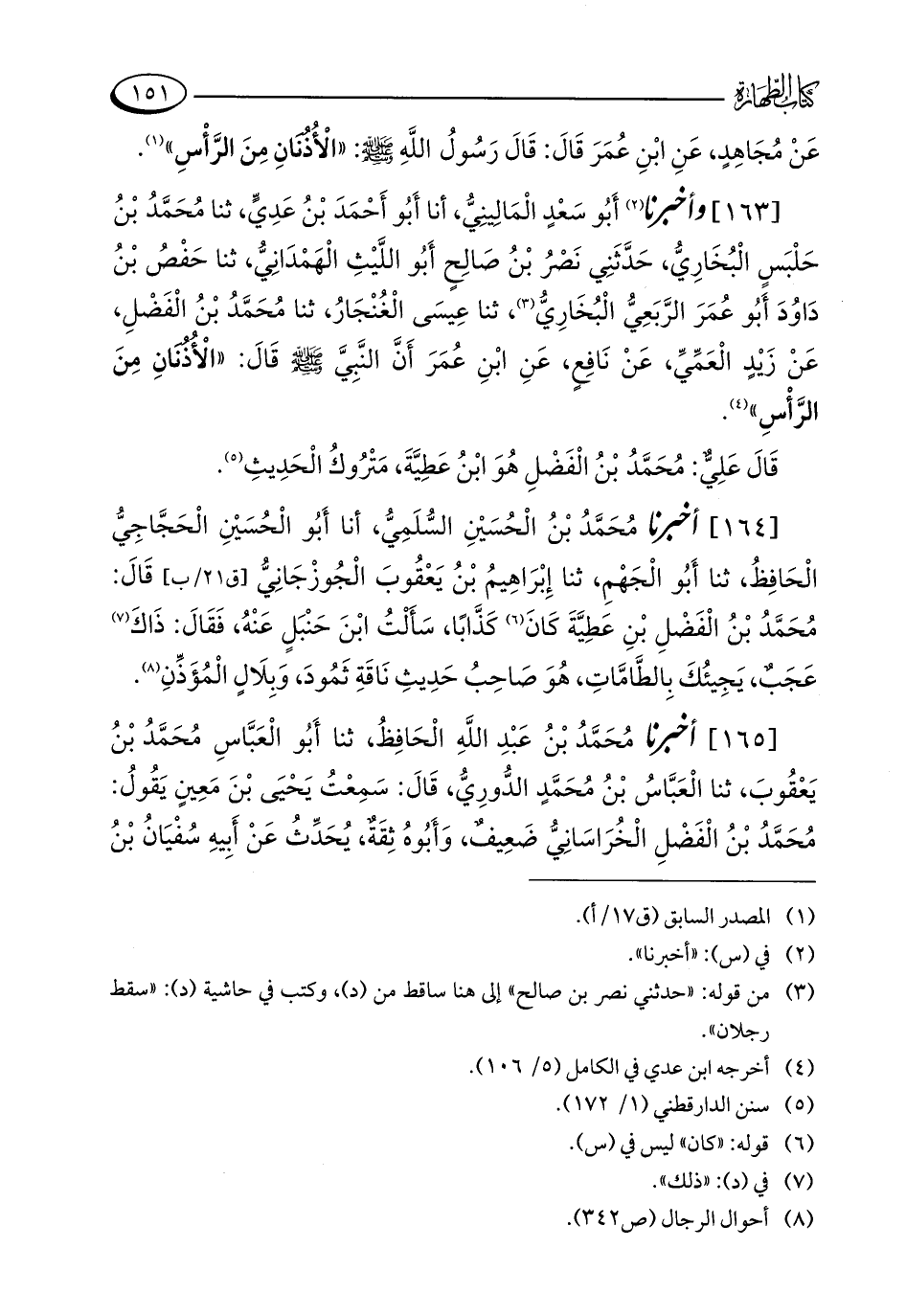 [163] وأخبرنا (¬2) أَبُو سَعْدٍ الْمَالِينِيُّ، أنا أَبُو أَحْمَدَ بْنُ عَدِيٍّ، ثنا مُحَمَّدُ بْنُ حَلْبَسِ الْبُخَارِيُّ، حَدَّثَنِي نَصْرُ بْنُ صَالِحٍ أَبُو اللَّيْثِ الْهَمْدَانِيُّ، ثنا حَفْصُ بْنُ دَاوُدَ أَبُو عُمَرَ الرَّبَعِيُّ الْبُخَارِيُّ (¬3)، ثنا عِيسَى الْغُنْجَارُ، ثنا مُحَمَّدُ بْنُ الْفَضْلِ، عَنْ زَيْدٍ الْعَمِّيِّ، عَنْ نَافِعٍ، عَنِ ابْنِ عُمَرَ أَنَّ النَّبِيَّ - صلى الله عليه وسلم - قَالَ: "الْأُذُنَانِ مِنَ الرَّأْسِ" (¬4).