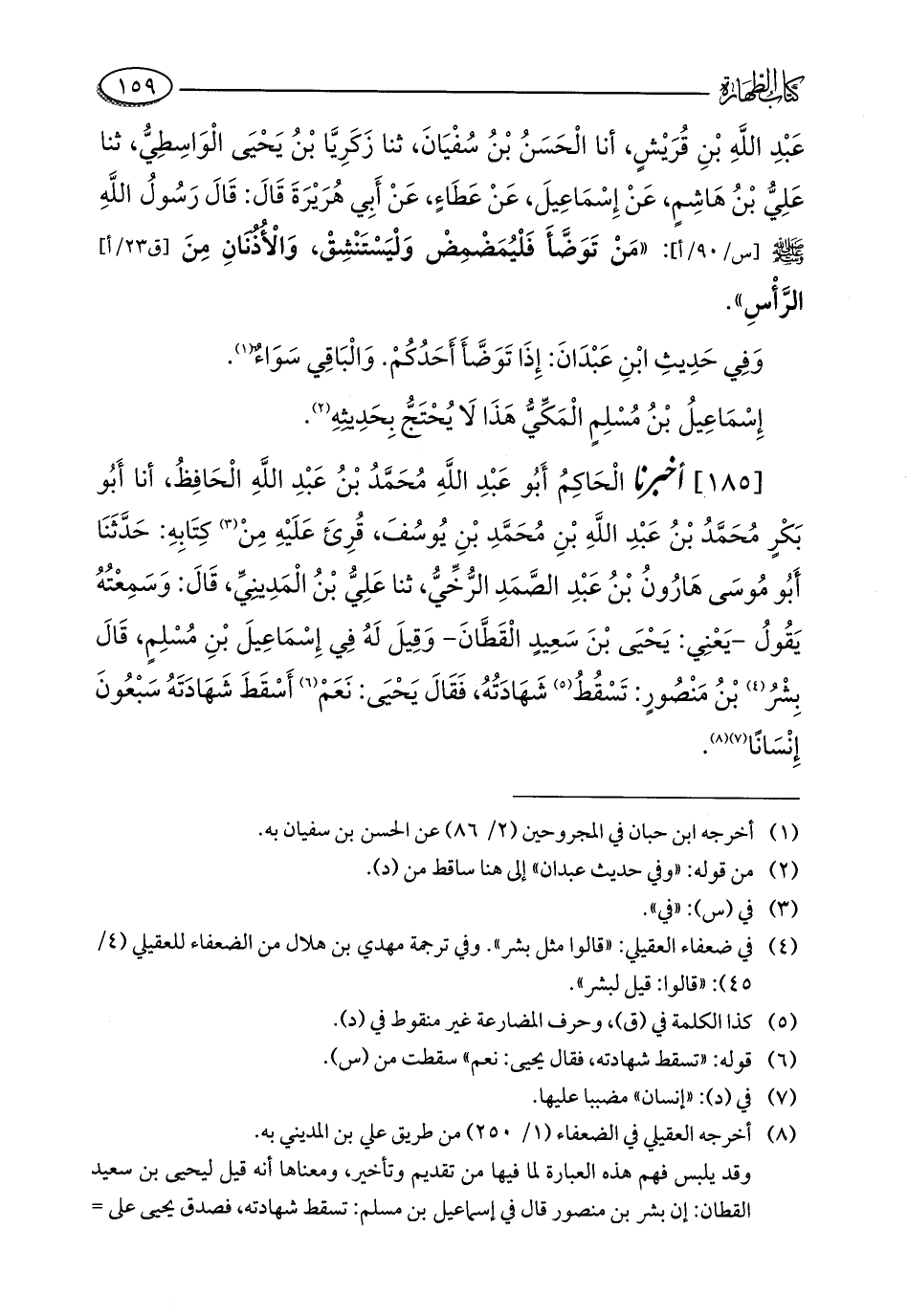[185] أخبرنا الْحَاكِمُ أَبُو عَبْدِ اللَّهِ مُحَمَّدُ بْنُ عَبْدِ اللَّهِ الْحَافِظُ، أنا أَبُو بَكْرٍ مُحَمَّدُ بْنُ عَبْدِ اللَّهِ بْنِ مُحَمَّدِ بْنِ يُوسُفَ، قُرِئَ عَلَيْهِ مِنْ (¬3) كِتَابِهِ: حَدَّثَنَا أَبُو مُوسَى هَارُونُ بْنُ عَبْدِ الصَّمَدِ الرُّخِّيُّ، ثنا عَلِيُّ بْنُ الْمَدِينِيِّ، قَالَ: وَسَمِعْتُهُ يَقُولُ - يَعْنِي: يَحْيَى بْنَ سَعِيدٍ الْقَطَّانَ - وَقِيلَ لَهُ فِي إِسْمَاعِيلَ بْنِ مُسْلِمٍ، قَالَ بِشْرُ (¬4) بْنُ مَنْصُورٍ: تَسْقُطُ (¬5) شَهَادَتُهُ، فَقَالَ يَحْيَى: نَعَمْ (¬6) أَسْقَطَ شَهَادَتَهُ سَبْعُونَ إِنْسَانًا (¬7) (¬8).