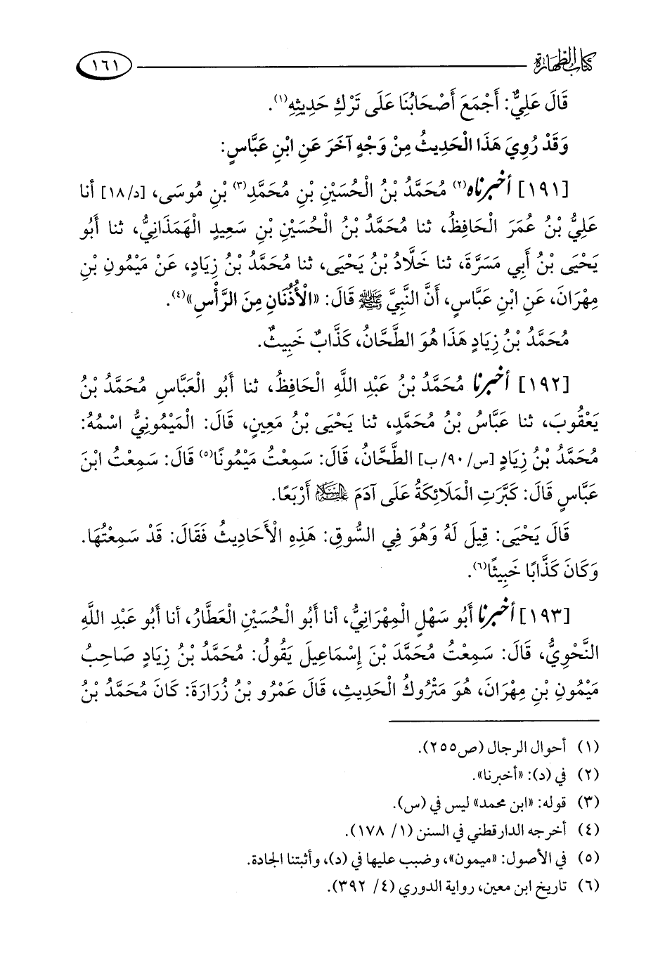 [191] أخبرناه (¬2) مُحَمَّدُ بْنُ الْحُسَيْنِ بْنِ مُحَمَّدِ (¬3) بْنِ مُوسَى، أنا عَلِيُّ بْنُ عُمَرَ الْحَافِظُ، ثنا مُحَمَّدُ بْنُ الْحُسَيْنِ بْنِ سَعِيدٍ الْهَمَذَانِيُّ، ثنا أَبُو يَحْيَى بْنُ أَبِي مَسَرَّةَ، ثنا خَلَّادُ بْنُ يَحْيَى، ثنا مُحَمَّدُ بْنُ زِيَادٍ، عَنْ مَيْمُونِ بْنِ مِهْرَانَ، عَنِ ابْنِ عَبَّاسٍ، أَنَّ النَّبِيَّ - صلى الله عليه وسلم - قالَ: "الْأُذُنَانِ مِنَ الرَّأْسِ" (¬4).