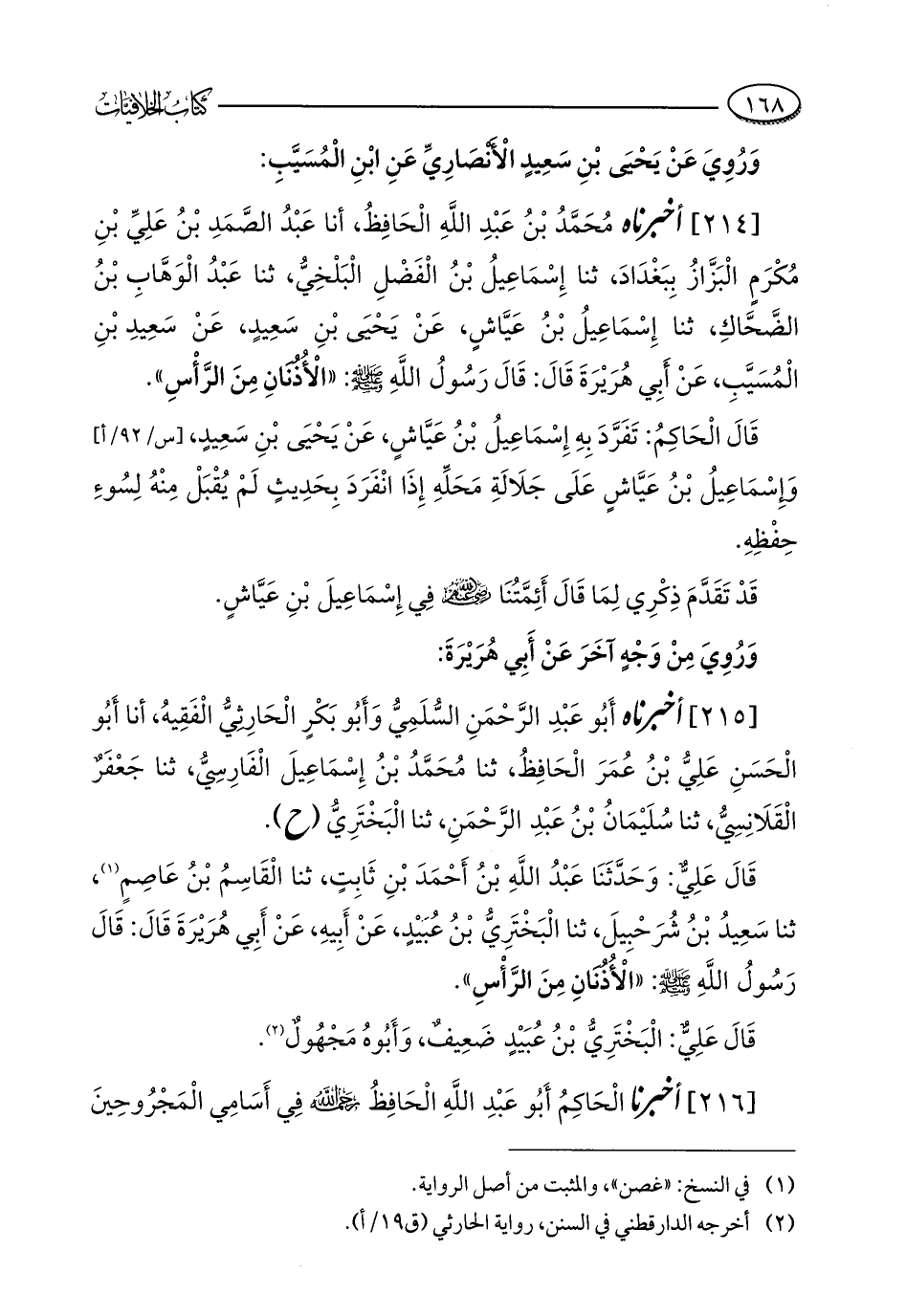 [214] أخبرناه مُحَمَّدُ بْنُ عَبْدِ اللَّهِ الْحَافِظُ، أنا عَبْدُ الصَّمَدِ بْنُ عَلِيِّ بْنِ مُكْرَمٍ الْبَزَّازُ بِبَغْدَادَ، ثنا إِسْمَاعِيلُ بْنُ الْفَضْلِ الْبَلْخِيُّ، ثنا عَبْدُ الْوَهَّابِ بْنُ الضَّحَّاكِ، ثنا إِسْمَاعِيلُ بْنُ عَيَّاشٍ، عَنْ يَحْيَى بْنِ سَعِيدٍ، عَنْ سَعِيدِ بْنِ الْمُسَيَّبِ، عَنْ أَبِي هُرَيْرَةَ قَالَ: قَالَ رَسُولُ اللَّهِ - صلى الله عليه وسلم -: "الْأُذُنَانِ مِنَ الرَّأْسِ".