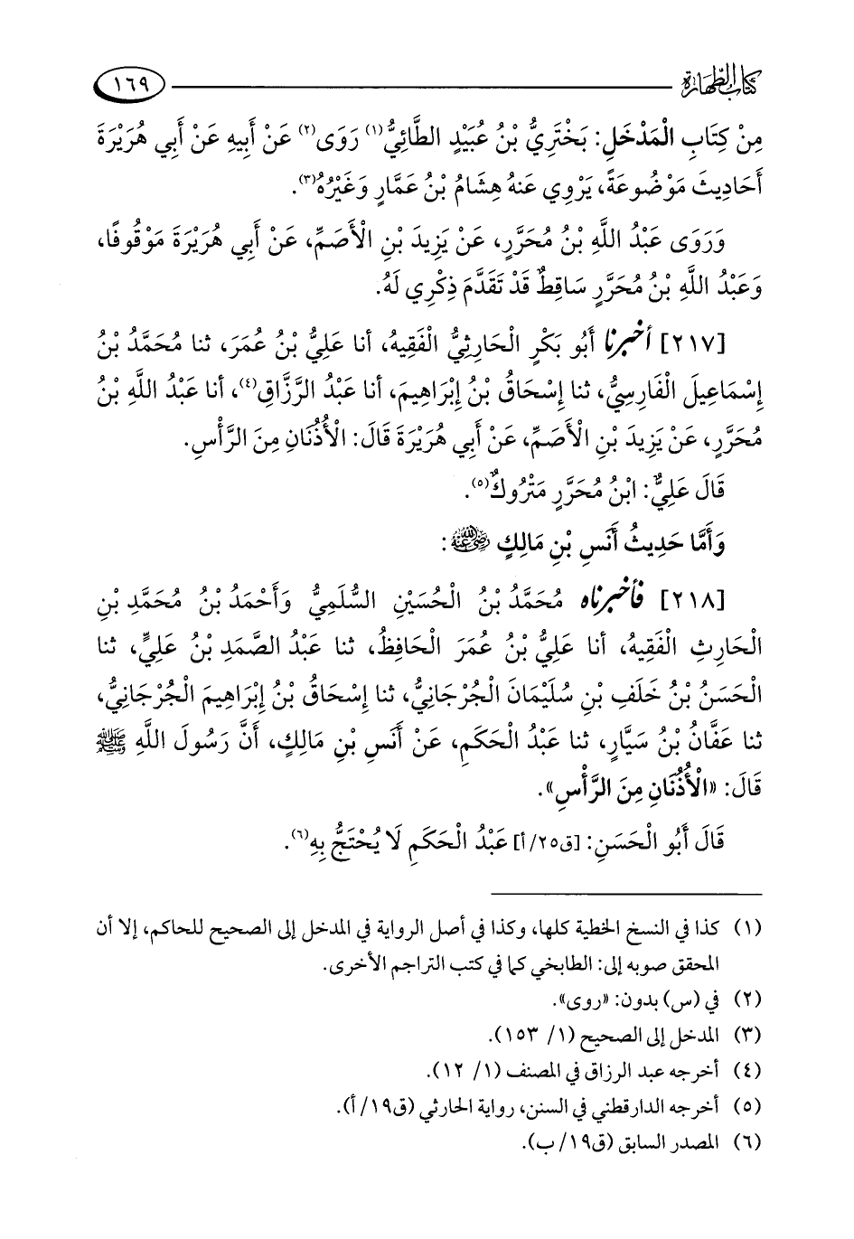[217] أخبرنا أَبُو بَكْرٍ الْحَارِثِيُّ الْفَقِيهُ، أنا عَلِيُّ بْنُ عُمَرَ، ثنا مُحَمَّدُ بْنُ إِسْمَاعِيلَ الْفَارِسِيُّ، ثنا إِسْحَاقُ بْنُ إِبْرَاهِيمَ، أنا عَبْدُ الرَّزَّاقِ (¬4)، أنا عَبْدُ اللَّهِ بْنُ مُحَرَّرٍ، عَنْ يَزِيدَ بْنِ الْأَصَمِّ، عَنْ أَبِي هُرَيْرَةَ قَالَ: الْأُذُنَانِ مِنَ الرَّأْسِ.