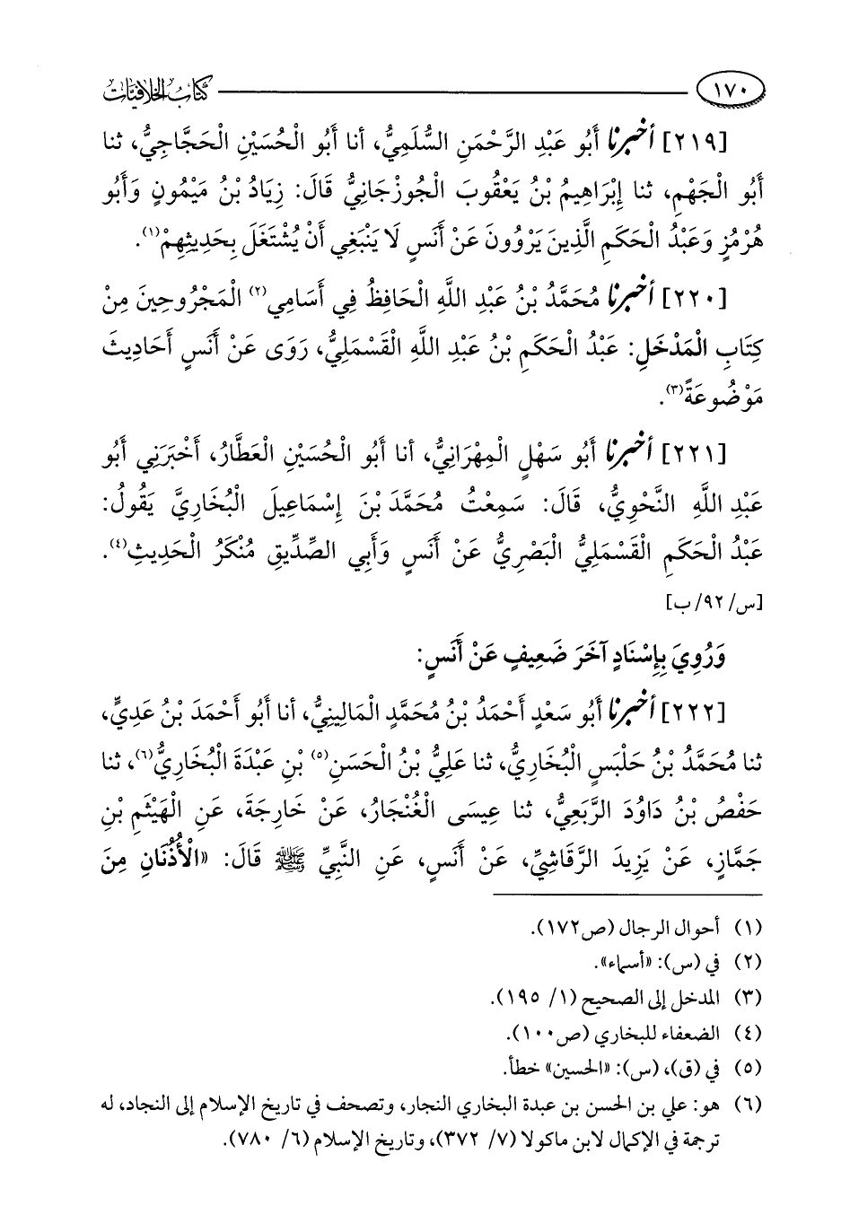 (¬6) هو: علي بن الحسن بن عبدة البخاري النجار، وتصحف في تاريخ الإسلام إلى النجاد، له ترجمة في الإكمال لابن ماكولا (7/ 372)، وتاريخ الإسلام (6/ 780).