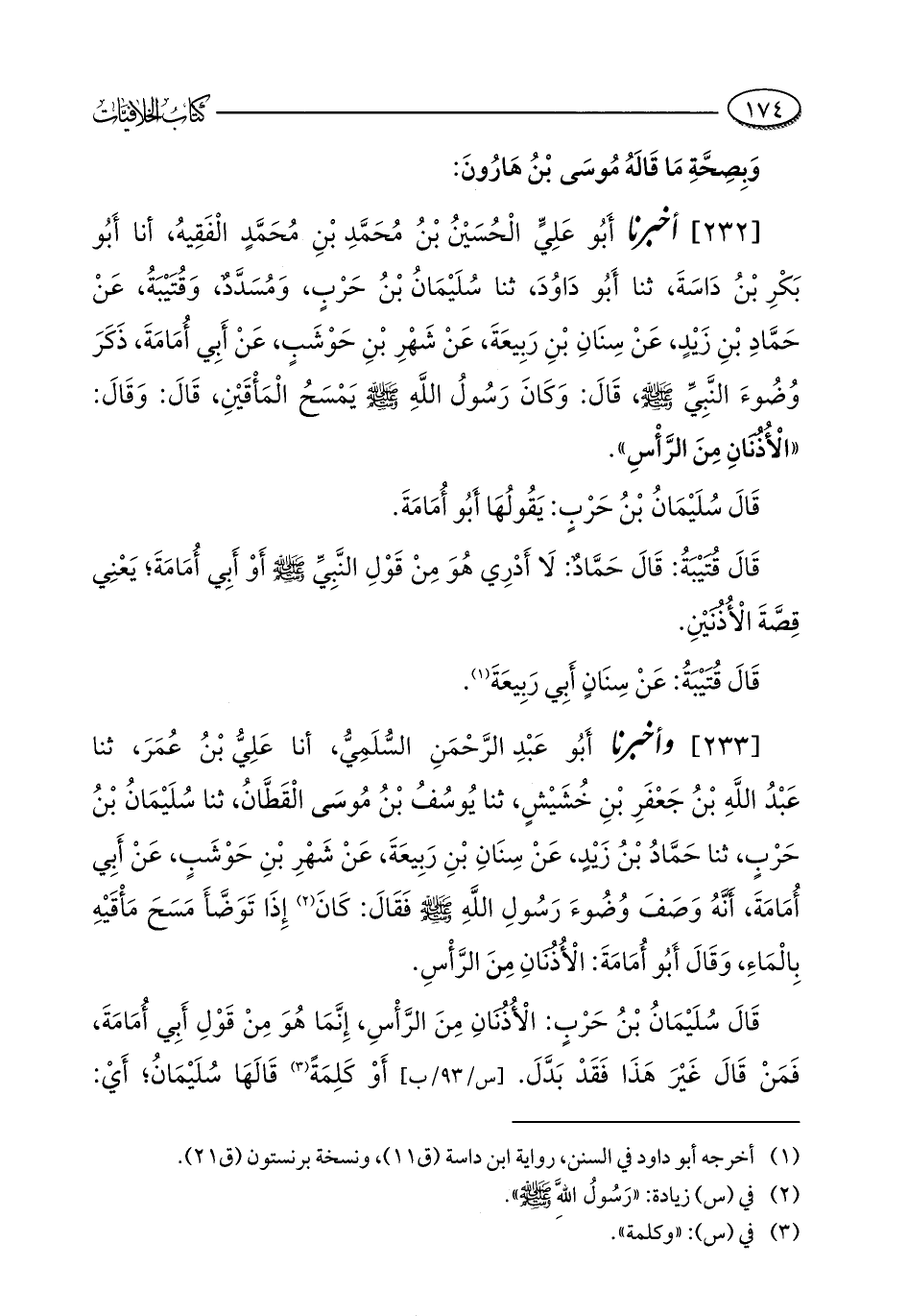 [233] وأخبرنا أَبُو عَبْدِ الرَّحْمَنِ السُّلَمِيُّ، أنا عَلِيُّ بْنُ عُمَرَ، ثنا عَبْدُ اللَّهِ بْنُ جَعْفَرِ بْنِ خُشَيْشٍ، ثنا يُوسُفُ بْنُ مُوسَى الْقَطَّانُ، ثنا سُلَيْمَانُ بْنُ حَرْبٍ، ثنا حَمَّادُ بْنُ زَيْدٍ، عَنْ سِنَانِ بْنِ رَبِيعَةَ، عَنْ شَهْرِ بْنِ حَوْشَبٍ، عَنْ أَبِي أُمَامَةَ، أَنَّهُ وَصَفَ وُضُوءَ رَسُولِ اللَّهِ - صلى الله عليه وسلم - فقَالَ: كَانَ (¬2) إِذَا تَوَضَّأَ مَسَحَ مَأْقَيْهِ بِالْمَاءِ، وَقَالَ أَبُو أُمَامَةَ: الْأُذُنَانِ مِنَ الرَّأْسِ.