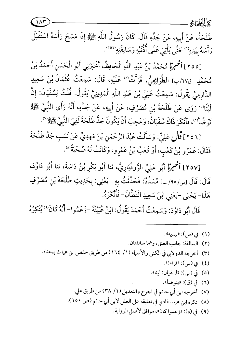 [255] أخبرنا مُحَمَّدُ بْنُ عَبْدِ اللَّهِ الْحَافِظُ، أَخْبَرَنِي أَبُو الْحَسَنِ أَحْمَدُ بْنُ مُحَمَّدٍ الطَّرَائِفِيُّ، قَرَأْتُ (¬4) عَلَيْهِ، قَالَ: سَمِعْتُ عُثْمَانَ بْنَ سَعِيدٍ الدَّارِمِيَّ يَقُولُ: سَمِعْتُ عَلِيَّ بْنَ عَبْدِ اللَّهِ الْمَدِينِيَّ يَقُولُ: قُلْتُ لِسُفْيَانَ: إِنَّ لَيْثًا (¬5) رَوَى عَنْ طَلْحَةَ بْنِ مُصَرِّفٍ، عَنْ أَبِيهِ، عَنْ جَدِّهِ، أَنَّهُ رَأَى النَّبِيَّ - صلى الله عليه وسلم - تَوَضَّأَ (¬6)، فَأَنْكَرَ ذَاكَ سُفْيَانُ، وَعَجِبَ أَنْ يَكُونَ جَدُّ طَلْحَةَ لَقِيَ النَّبِيَّ - صلى الله عليه وسلم - (¬7).