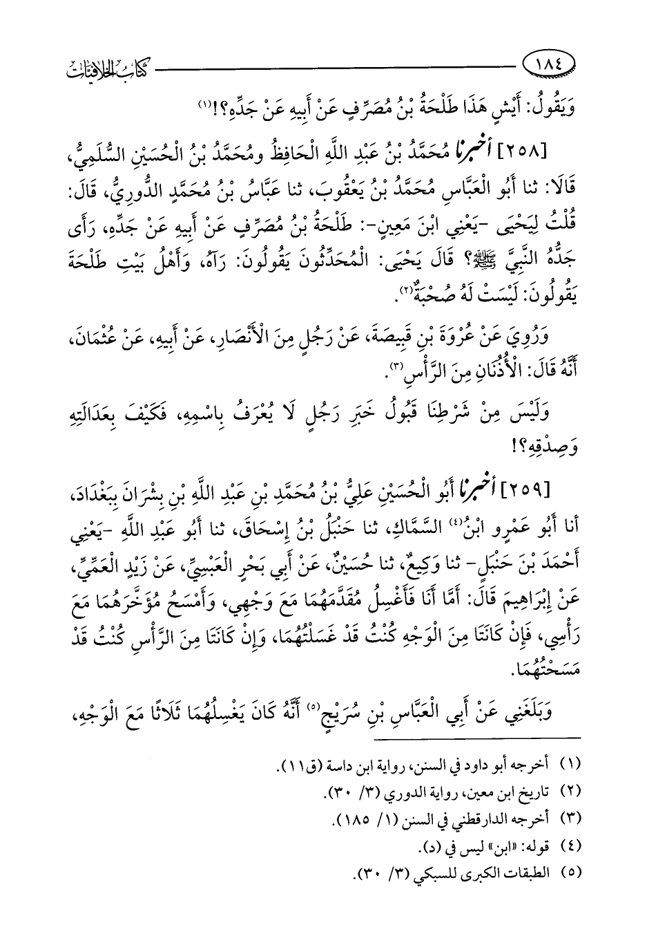 [258] أخبرنا مُحَمَّدُ بْنُ عَبْدِ اللَّهِ الْحَافِظُ ومُحَمَّدُ بْنُ الْحُسَيْنِ السُّلَمِيُّ، قَالَا: ثنا أَبُو الْعَبَّاسِ مُحَمَّدُ بْنُ يَعْقُوبَ، ثنا عَبَّاسُ بْنُ مُحَمَّدٍ الدُّورِيُّ، قَالَ: قُلْتُ لِيَحْيَى - يَعْنِي ابْنَ مَعِينٍ -: طَلْحَةُ بْنُ مُصَرِّفٍ عَنْ أَبِيهِ عَنْ جَدِّهِ، رَأَى جَدُّهُ النَّبِيَّ - صلى الله عليه وسلم -؟ قَالَ يَحْيَى: الْمُحَدِّثُونَ يَقُولُونَ: رَآهُ، وَأَهْلُ بَيْتِ طَلْحَةَ يَقُولُونَ: لَيْسَتْ لَهُ صُحْبَةٌ (¬2).