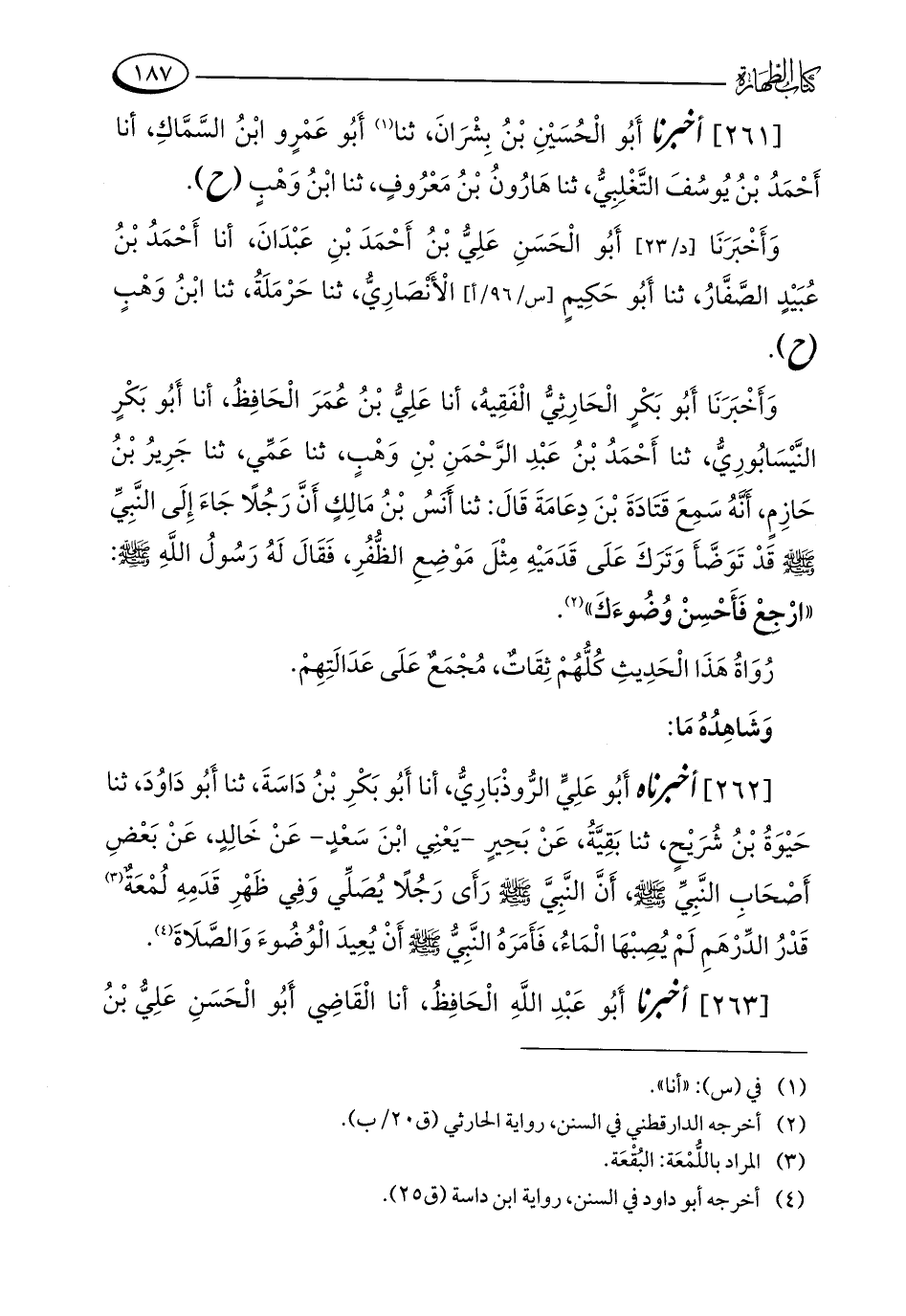 وَأَخْبَرَنَا أَبُو بَكْرٍ الْحَارِثِيُّ الْفَقِيهُ، أنا عَلِيُّ بْنُ عُمَرَ الْحَافِظُ، أنا أَبُو بَكْرٍ النَّيْسَابُورِيُّ، ثنا أَحْمَدُ بْنُ عَبْدِ الرَّحْمَنِ بْنِ وَهْبٍ، ثنا عَمِّي، ثنا جَرِيرُ بْنُ حَازِمٍ، أَنَّهُ سَمِعَ قَتَادَةَ بْنَ دِعَامَةَ قَالَ: ثنا أَنَسُ بْنُ مَالِكٍ أَنَّ رَجُلًا جَاءَ إِلَى النَّبِيِّ - صلى الله عليه وسلم - قَدْ تَوَضَّأَ وَتَرَكَ عَلَى قَدَمَيْهِ مِثْلَ مَوْضِعِ الظُّفُرِ، فَقَالَ لَهُ رَسُولُ اللَّهِ - صلى الله عليه وسلم -: "ارْجِعْ فَأَحْسِنْ وُضُوءَكَ" (¬2).