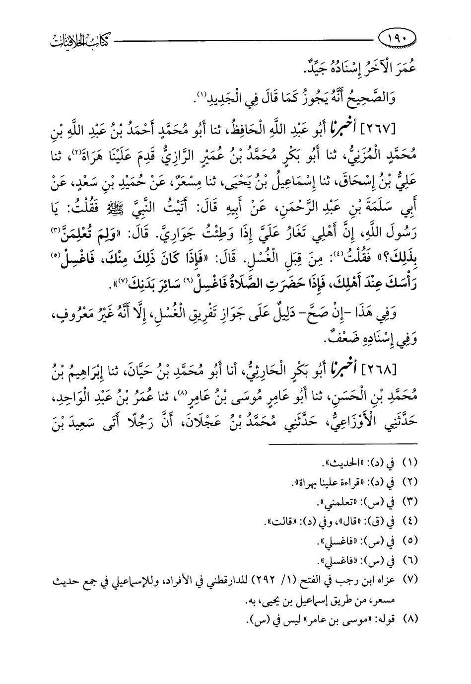 [267] أخبرنا أَبُو عَبْدِ اللَّهِ الْحَافِظُ، ثنا أَبُو مُحَمَّدٍ أَحْمَدُ بْنُ عَبْدِ اللَّهِ بْنِ مُحَمَّدٍ الْمُزَنِيُّ، ثنا أَبُو بَكْرٍ مُحَمَّدُ بْنُ عُمَيْرٍ الرَّازِيُّ قَدِمَ عَلَيْنَا هَرَاةَ (¬2)، ثنا عَلِيُّ بْنُ إِسْحَاقَ، ثنا إِسْمَاعِيلُ بْنُ يَحْيَى، ثنا مِسْعَرٌ، عَنْ حُمَيْدِ بْنِ سَعْدٍ، عَنْ أَبِي سَلَمَةَ بْنِ عَبْدِ الرَّحْمَنِ، عَنْ أَبِيهِ قَالَ: أَتَيْتُ النَّبِيَّ - صلى الله عليه وسلم - فقُلْتُ: يَا رَسُولَ اللَّهِ، إِنَّ أَهْلِي تَغَارُ عَلَيَّ إِذَا وَطِئْتُ جَوَارِيَّ. قَالَ: "وَلمَ تُعْلِمَنَّ (¬3) بِذَلِكَ؟ " فَقُلْتُ (¬4): مِنَ قِبَلِ الْغُسْلِ. قَالَ: "فَإِذَا كَانَ ذَلِكَ مِنْكَ، فَاغْسِلْ (¬5) رَأْسَكَ عِنْدَ أَهْلِكَ، فَإِذَا حَضَرَتِ الصَّلَاةُ فَاغْسِلْ (¬6) سَائِرَ بَدَنِكَ (¬7) ".