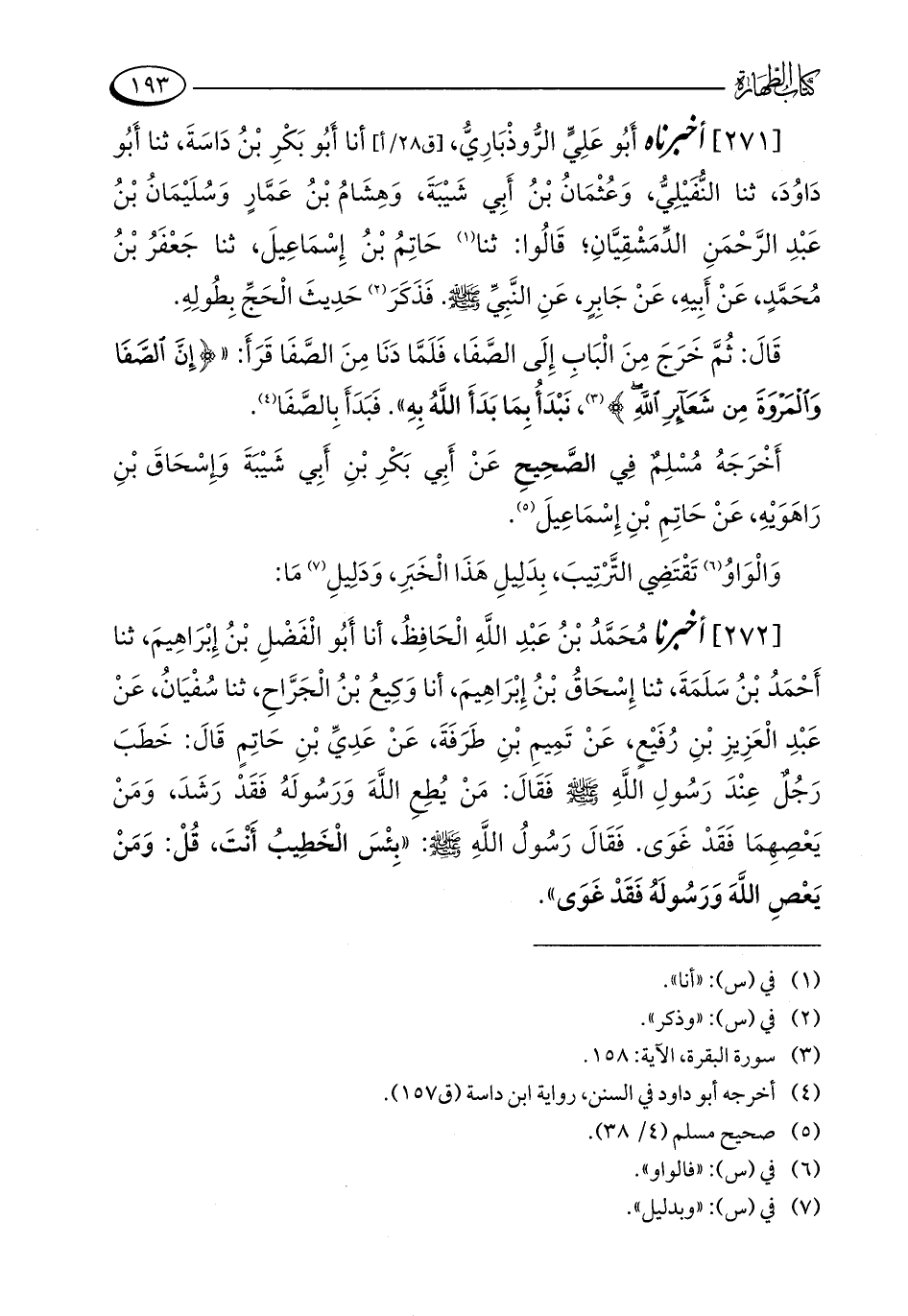 [271] أخبرناه أَبُو عَلِيٍّ الرُّوذْبَارِيُّ، أنا أَبُو بَكْرِ بْنُ دَاسَةَ، ثنا أَبُو دَاوُدَ، ثنا النُّفَيْلِيُّ، وَعُثْمَانُ بْنُ أَبِي شَيْبَةَ، وَهِشَامُ بْنُ عَمَّارٍ وَسُلَيْمَانُ بْنُ عَبْدِ الرَّحْمَنِ الدِّمَشْقِيَّانِ؛ قَالُوا: ثنا (¬1) حَاتِمُ بْنُ إِسْمَاعِيلَ، ثنا جَعْفَرُ بْنُ مُحَمَّدٍ، عَنْ أَبِيهِ، عَنْ جَابِرٍ، عَنِ النَّبِيِّ - صلى الله عليه وسلم -. فَذَكَرَ (¬2) حَدِيثَ الْحَجِّ بِطُولِهِ.