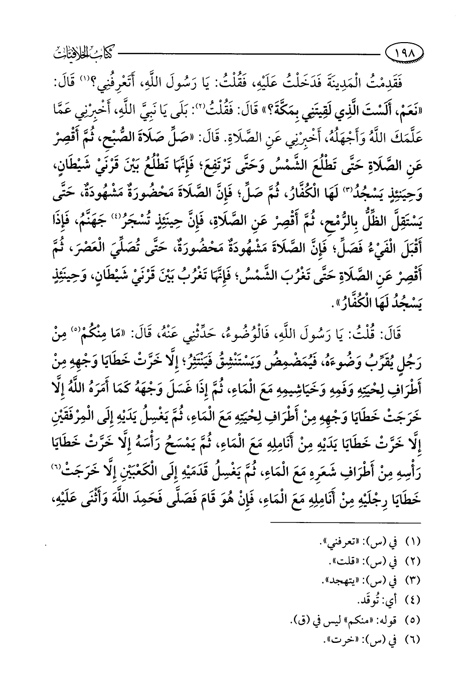 فَقَدِمْتُ الْمَدِينَةَ فَدَخَلْتُ عَلَيْهِ، فَقُلْتُ: يَا رَسولَ اللَّهِ، أَتَعْرِفُنِي؟ (¬1) قَالَ: "نَعَمْ، أَلَسْتَ الَّذِي لَقِيتَنِي بِمَكَّةَ؟ " قَالَ: فَقُلْتُ (¬2): بَلَى يَا نَبِيَّ اللَّهِ، أَخْبِرْنِي عَمَّا عَلَّمَكَ اللَّهُ وَأَجْهَلُهُ، أَخْبِرْنِي عَنِ الصَّلَاةِ. قَالَ: "صَلِّ صَلَاةَ الصُّبْحِ، ثُمَّ أَقْصِرْ عَنِ الصَّلَاةِ حَتَّى تَطْلُعَ الشَّمْسُ وَحَتَّى تَرْتَفِعَ؛ فَإِنَّهَا تَطْلُعُ بَيْنَ قَرْنَيْ شَيْطَانٍ، وَحِينَئِذٍ يَسْجُدُ (¬3) لَهَا الْكُفَّارُ، ثُمَّ صَلِّ؛ فَإِنَّ الصَّلَاةَ مَحْضُورَةٌ مَشْهُودَةٌ، حَتَّى يَسْتَقِلَّ الظِّلُّ بِالرُّمْحِ، ثُمَّ أَقْصِرْ عَنِ الصَّلَاةِ، فَإِنَّ حِينَئِذٍ تُسْجَرُ (¬4) جَهَنَّمُ، فَإِذَا أَقْبَلَ الْفَيْءُ فَصَلِّ؛ فَإِنَّ الصَّلَاةَ مَشْهُودَةٌ مَحْضُورَةٌ، حَتَّى تُصَلِّيَ الْعَصْرَ، ثُمَّ أَقْصِرْ عَنِ الصَّلَاةِ حَتَّى تَغْرُبَ الشَّمْسُ؛ فَإِنَّهَا تَغْرُبُ بَيْنَ قَرْنَيْ شَيْطَانٍ، وَحِينَئِذٍ يَسْجُدُ لَهَا الْكُفَّارُ".