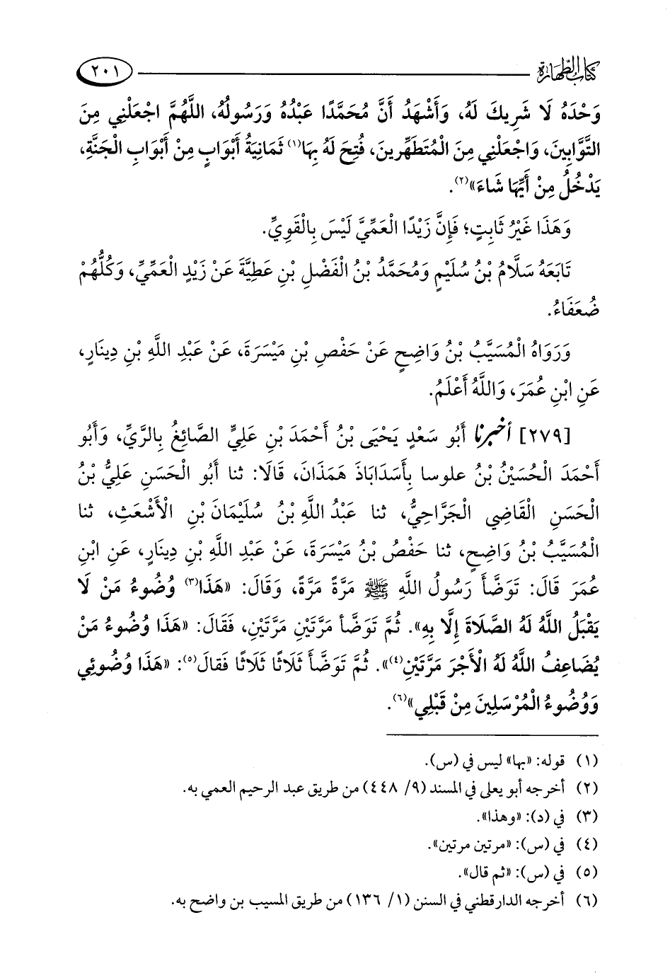 [279] أخبرنا أَبُو سَعْدٍ يَحْيَى بْنُ أَحْمَدَ بْنِ عَلِيٍّ الصَّائِغُ بِالرَّيِّ، وَأَبُو أَحْمَدَ الْحُسَيْنُ بْنُ علوسا بِأَسَدَابَاذَ هَمَذَانَ، قَالَا: ثنا أَبُو الْحَسَنِ عَلِيُّ بْنُ الْحَسَنِ الْقَاضِي الْجَرَّاحِيُّ، ثنا عَبْدُ اللَّهِ بْنُ سُلَيْمَانَ بْنِ الْأَشْعَثِ، ثنا الْمُسَيَّبُ بْنُ وَاضِحٍ، ثنا حَفْصُ بْنُ مَيْسَرَةَ، عَنْ عَبْدِ اللَّهِ بْنِ دِينَارٍ، عَنِ ابْنِ عُمَرَ قَالَ: تَوَضَّأَ رَسُولُ اللَّهِ - صلى الله عليه وسلم - مَرَّةً مَرَّةً، وَقَالَ: "هَذَا (¬3) وُضُوءُ مَنْ لَا يَقْبَلُ اللَّهُ لَهُ الصَّلَاةَ إِلَّا بِهِ". ثُمَّ تَوَضَّأ مَرَّتَيْنِ مَرَّتَيْنِ، فَقَالَ: "هَذَا وُضُوءُ مَنْ يُضَاعِفُ اللَّهُ لَهُ الْأَجْرَ مَرَّتَيْنِ (¬4) ". ثُمَّ تَوَضَّأَ ثَلَاثًا ثَلَاثًا فَقالَ (¬5): "هَذَا وُضُوئِي وَوُضُوءُ الْمُرْسَلِينَ مِنْ قَبْلِي" (¬6).
