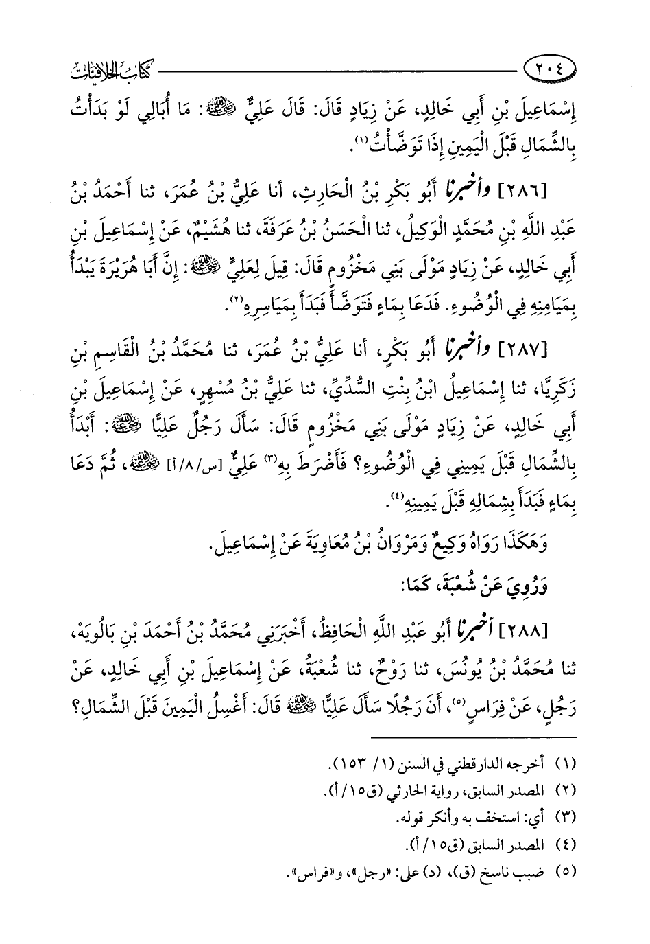 [286] وأخبرنا أَبُو بَكْرِ بْنُ الْحَارِثِ، أنا عَلِيُّ بْنُ عُمَرَ، ثنا أَحْمَدُ بْنُ عَبْدِ اللَّهِ بْنِ مُحَمَّدٍ الْوَكِيلُ، ثنا الْحَسَنُ بْنُ عَرَفَةَ، ثنا هُشَيْمٌ، عَنْ إِسْمَاعِيلَ بْنِ أَبِي خَالِدٍ، عَنْ زِيَادٍ مَوْلَى بَنِي مَخْزُومٍ قَالَ: قِيلَ لِعَلِيٍّ - رضي الله عنه -: إِنَّ أَبَا هُرَيْرَةَ يَبْدَأُ بِمَيَامِنِهِ فِي الْوُضُوءِ. فَدَعَا بِمَاءٍ فَتَوَضَّأَ فَبَدَأَ بِمَيَاسِرِهِ (¬2).
