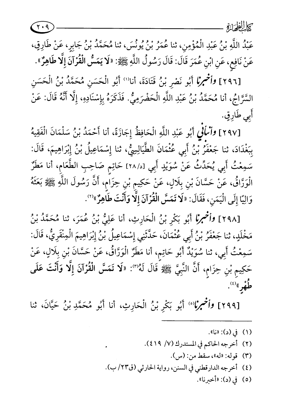 [298] وأخبرنا أَبُو بَكْرِ بْنُ الْحَارِثِ، أنا عَلِيُّ بْنُ عُمَرَ، ثنا مُحَمَّدُ بْنُ مَخْلَدٍ، ثنا جَعْفَرُ بْنُ أَبِي عُثْمَانَ، حَدَّثَنِي إِسْمَاعِيلُ بْنُ إِبْرَاهِيمَ الْمِنْقَرِيُّ، قَالَ: سَمِعْتُ أَبِي، ثنا سُوَيْدٌ أَبُو حَاتِمٍ، أنا مَطَرٌ الْوَرَّاقُ، عَنْ حَسَّانَ بْنِ بِلَالٍ، عَنْ حَكِيمِ بْنِ حِزَامٍ، أَنَّ النَّبِيَّ - صلى الله عليه وسلم - قَالَ لَهُ (¬3): "لَا تَمَسَّ الْقُرْآنَ إِلَّا وَأَنْتَ عَلَى طُهْرٍ" (¬4).