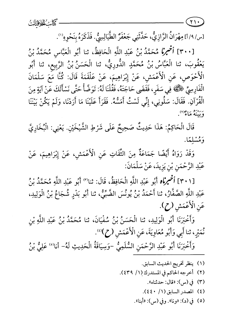 [300] أخبرنا مُحَمَّدُ بْنُ عَبْدِ اللَّهِ الْحَافِظُ، ثنا أَبُو الْعَبَّاسِ مُحَمَّدُ بْنُ يَعْقُوبَ، ثنا الْعَبَّاسُ بْنُ مُحَمَّدٍ الدُّورِيُّ، ثنا الْحَسَنُ بْنُ الرَّبِيعِ، ثنا أَبُو الْأَحْوَصِ، عَنِ الْأَعْمَشِ، عَنْ إِبْرَاهِيمَ، عَنْ عَلْقَمَةَ قَالَ: كُنَّا مَعَ سَلْمَانَ الْفَارِسِيِّ - رضي الله عنه - فِي سَفَرٍ، فَقَضَى حَاجَتَهُ، فَقُلْنَا لَهُ: تَوَضَّأْ حَتَّى نَسْأَلَكَ عَنْ آيَةٍ مِنَ الْقُرْآنِ. فَقَالَ: سَلُونِي، إِنِّي لَسْتُ أَمَسُّهُ. فَقَرَأَ عَلَيْنَا مَا أَرَدْنَا، وَلَمْ يَكُنْ بَيْنَنَا وَبَيْنَهُ مَاءٌ (¬2).