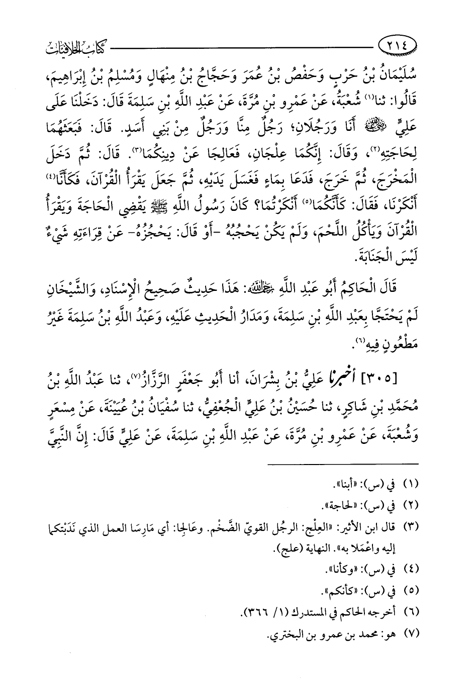 سُلَيْمَانُ بْنُ حَرْبٍ وَحَفْصُ بْنُ عُمَرَ وَحَجَّاجُ بْنُ مِنْهَالٍ وَمُسْلِمُ بْنُ إِبْرَاهِيمَ، قَالُوا: ثنا (¬1) شُعْبَةُ، عَنْ عَمْرِو بْنِ مُرَّةَ، عَنْ عَبْدِ اللَّهِ بْنِ سَلِمَةَ قَالَ: دَخَلْنَا عَلَى عَلِيِّ - رضي الله عنه - أَنَا وَرَجُلَانِ؛ رَجُلٌ مِنَّا وَرَجُلٌ مِنْ بَنِي أَسَدٍ. قَالَ: فَبَعَثَهُمَا لِحَاجَتِهِ (¬2)، وَقَالَ: إِنَّكُمَا عِلْجَانِ، فَعَالِجَا عَنْ دِينِكُمَا (¬3). قَالَ: ثُمَّ دَخَلَ الْمَخْرَجَ، ثُمَّ خَرَجَ، فَدَعَا بِمَاءٍ فَغَسَلَ يَدَيْهِ، ثُمَّ جَعَلَ يَقْرَأُ الْقُرْآنَ، فَكَأَنَّا (¬4) أَنْكَرْنَا، فَقَالَ: كَأَنَّكُمَا (¬5) أَنْكَرْتُمَا؟ كَانَ رَسُولُ اللَّهِ - صلى الله عليه وسلم - يَقْضِي الْحَاجَةَ وَيَقْرَأُ الْقُرْآنَ وَيَأْكُلُ اللَّحْمَ، وَلَمْ يَكُنْ يَحْجُبُهُ - أَوْ قَالَ: يَحْجُزُهُ - عَنْ قِرَاءَتِهِ شَيْءٌ لَيْسَ الْجَنَابَةَ.