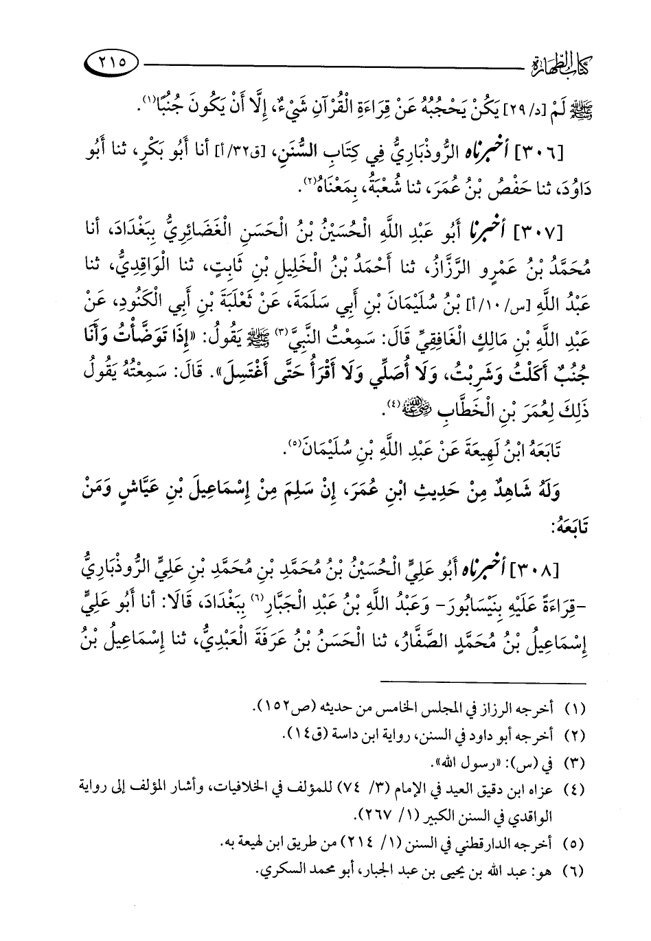 [307] أخبرنا أَبُو عَبْدِ اللَّهِ الْحُسَيْنُ بْنُ الْحَسَنِ الْغَضَائِرِيُّ بِبَغْدَادَ، أنا مُحَمَّدُ بْنُ عَمْرٍو الرَّزَّازُ، ثنا أَحْمَدُ بْنُ الْخَلِيلِ بْنِ ثَابِتٍ، ثنا الْوَاقِدِيُّ، ثنا عَبْدُ اللَّهِ بْنُ سُلَيْمَانَ بْنِ أَبِي سَلَمَةَ، عَنْ ثَعْلَبَةَ بْنِ أَبِي الْكَنُودِ، عَنْ عَبْدِ اللَّهِ بْنِ مَالِكٍ الْغَافِقِيِّ قَالَ: سَمِعْتُ النَّبِيَّ (¬3) - صلى الله عليه وسلم - يقُولُ: "إِذَا تَوَضَّأْتُ وَأَنَا جُنُبٌ أَكَلْتُ وَشَرِبْتُ، وَلَا أُصَلِّي وَلَا أَقْرَأُ حَتَّى أَغْتَسِلَ". قَالَ: سَمِعْتُهُ يَقُولُ ذَلِكَ لِعُمَرَ بْنِ الْخَطَّابِ - رضي الله عنه - (¬4).