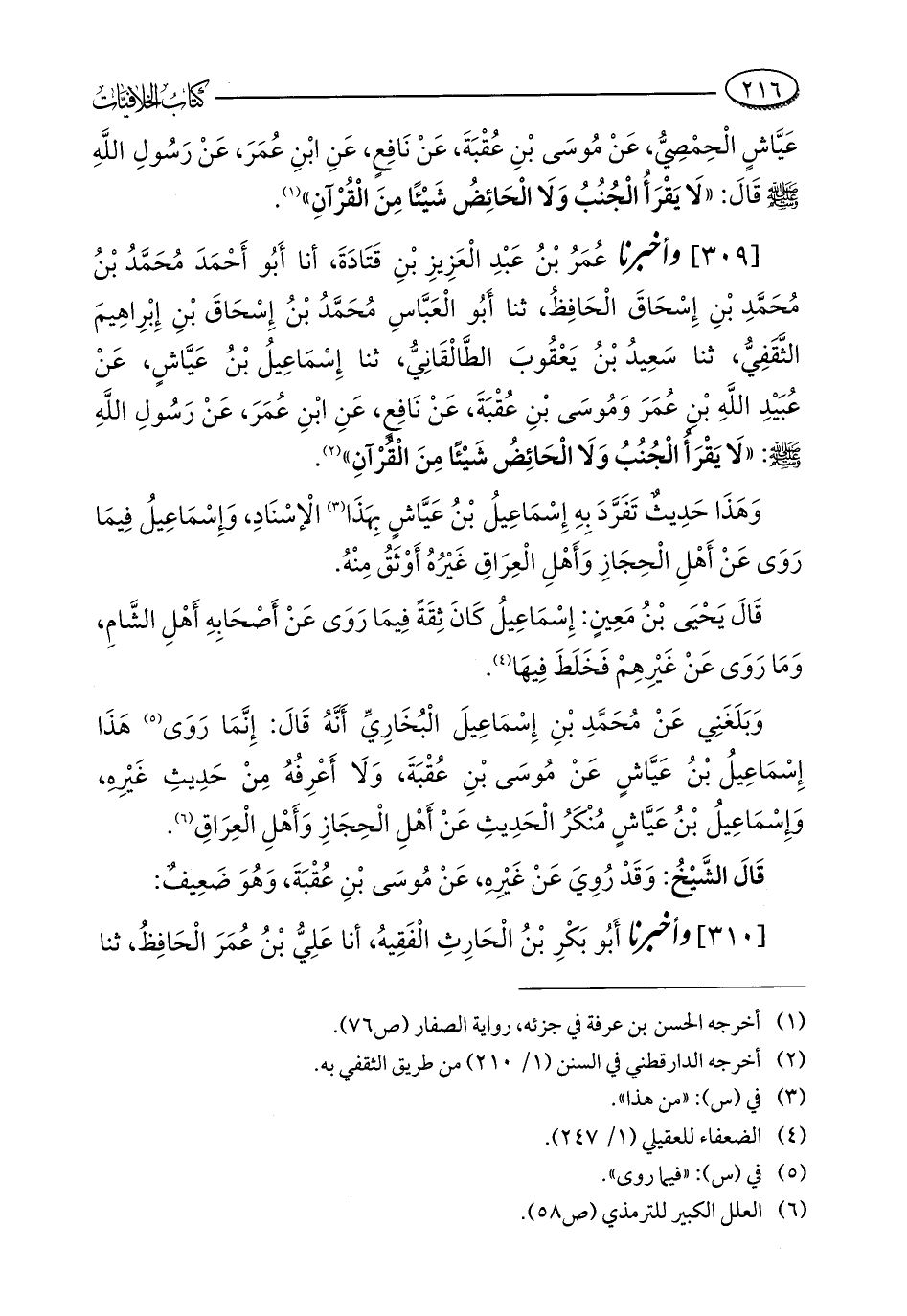 [309] وأخبرنا عُمَرُ بْنُ عَبْدِ الْعَزِيزِ بْنِ قَتَادَةَ، أنا أَبُو أَحْمَدَ مُحَمَّدُ بْنُ مُحَمَّدِ بْنِ إِسْحَاقَ الْحَافِظُ، ثنا أَبُو الْعَبَّاسِ مُحَمَّدُ بْنُ إِسْحَاقَ بْنِ إِبْرِاهِيمَ الثَّقَفِيُّ، ثنا سَعِيدُ بْنُ يَعْقُوبَ الطَّالْقَانِيُّ، ثنا إِسْمَاعِيلُ بْنُ عَيَّاشٍ، عَنْ عُبَيْدِ اللَّهِ بْن عُمَرَ وَمُوسَى بْن عُقْبَةَ، عَنْ نَافِعٍ، عَن ابْنِ عُمَرَ، عَنْ رَسُولِ اللَّهِ - صلى الله عليه وسلم -: "لَا يَقْرَأُ الْجُنُبُ وَلَا الْحَائِضُ شَيْئًا مِنَ الْقُرْآنِ" (¬2).