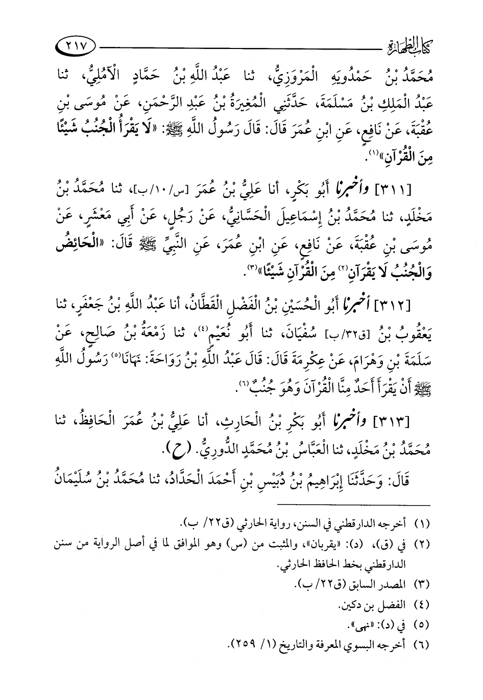 [313] أخبرنا أَبُو بَكْرِ بْنُ الْحَارِثِ، أنا عَلِيُّ بْنُ عُمَرَ الْحَافِظُ، ثنا مُحَمَّدُ بْنُ مَخْلَدٍ، ثنا الْعَبَّاسُ بْنُ مُحَمَّدٍ الدُّورِيُّ. (ح).