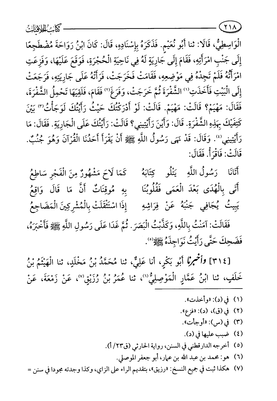 الْوَاسِطِيُّ، قَالَا: ثنا أَبُو نُعَيْمٍ. فَذَكَرَهُ بِإِسْنَادِهِ، قَالَ: كَانَ ابْنُ رَوَاحَةَ مُضْطَجِعًا إِلَى جَنْبِ امْرَأَتِهِ، فَقَامَ إِلَى جَارِيَةٍ لَهُ فِي نَاحِيَةِ الْحُجْرَةِ، فَوَقَعَ عَلَيْهَا، وَفَزِعَتِ امْرَأَتُهُ فَلَمْ تَجِدْهُ فِي مَوْضِعِهِ، فَقَامَتْ فَخَرَجَتْ، فَرَأَتْهُ عَلَى جَارِيَتِهِ، فَرَجَعَتْ إِلَى الْبَيْتِ فَأَخَذَتِ (¬1) الشَّفْرَةَ ثُمَّ خَرَجَتْ، وَفَرَغَ (¬2) فَقَامَ، فَلَقِيَهَا تَحْمِلُ الشَّفْرَةَ، فَقَالَ: مَهْيَمْ؟ قَالَتْ: مَهْيَمْ. قَالَتْ: لَوْ أَدْرَكْتُكَ حَيْثُ رَأَيْتُكَ لَوَجَأْتُ (¬3) بَيْنَ كَتِفَيْكَ بِهَذِهِ الشَّفْرَةِ. قَالَ: وَأَيْنَ رَأَيْتِينِي؟ قَالَتْ: رَأَيْتُكَ عَلَى الْجَارِيَةِ. فَقَالَ: مَا رَأَيْتِينِي (¬4). وَقَالَ: قَدْ نَهَى رَسُولُ اللَّهِ - صلى الله عليه وسلم - أنْ يَقْرَأَ أَحَدُنَا الْقُرْآنَ وَهُوَ جُنُبٌ. قَالَتْ: فَاقْرَأْ. فَقَالَ: