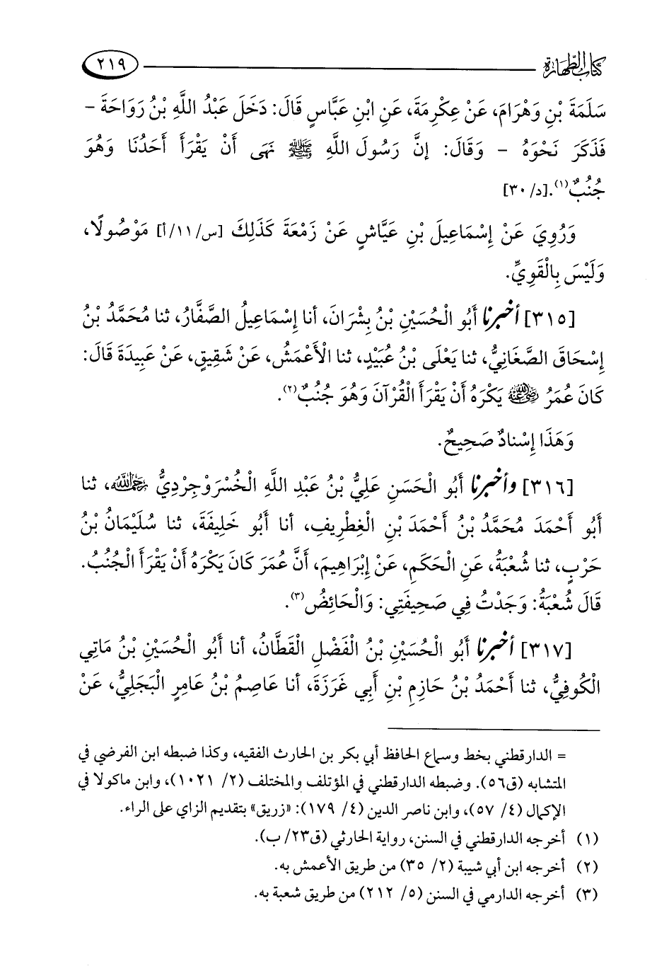 [315] أخبرنا أَبُو الْحُسَيْنِ بْنُ بِشْرَانَ، أنا إِسْمَاعِيلُ الصَّفَّارُ، ثنا مُحَمَّدُ بْنُ إِسْحَاقَ الصَّغَانِيُّ، ثنا يَعْلَى بْنُ عُبَيْدٍ، ثنا الْأَعْمَشُ، عَنْ شَقِيقٍ، عَنْ عَبِيدَةَ قَالَ: كَانَ عُمَرُ - رضي الله عنه - يَكْرَهُ أَنْ يَقْرَأَ الْقُرْآنَ وَهُوَ جُنُبٌ (¬2).