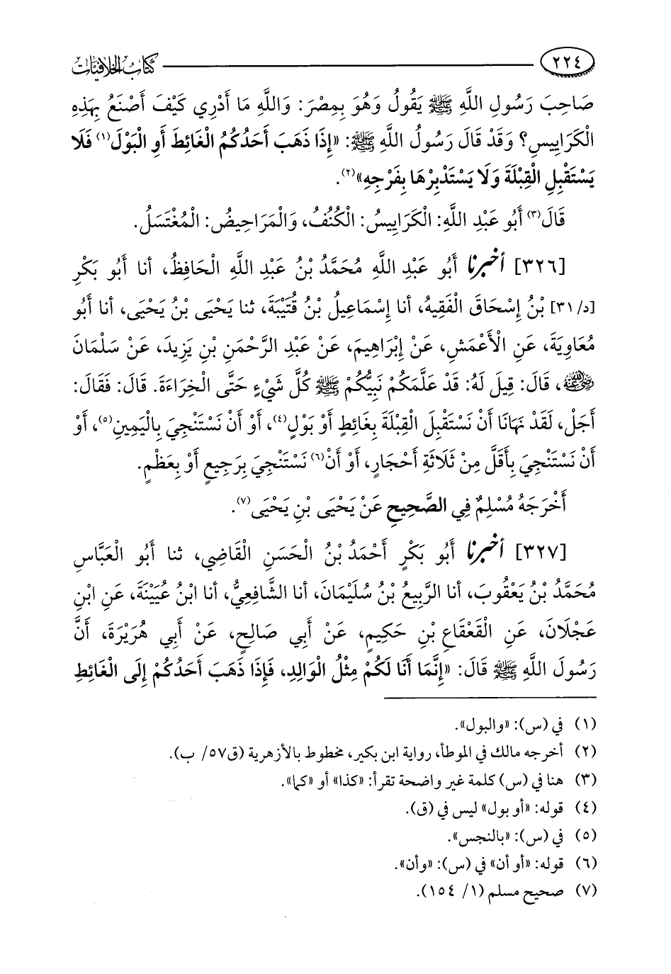 [326] أخبرنا أَبُو عَبْدِ اللَّهِ مُحَمَّدُ بْنُ عَبْدِ اللَّهِ الْحَافِظُ، أنا أَبُو بَكْرِ بْنُ إِسْحَاقَ الْفَقِيهُ، أنا إِسمَاعِيلُ بْنُ قُتَيْبَةَ، ثنا يَحْيَى بْنُ يَحْيَى، أنا أَبُو مُعَاوِيَةَ، عَنِ الْأَعْمَشِ، عَنْ إِبْرَاهِيمَ، عَنْ عَبْدِ الرَّحْمَنِ بْنِ يَزِيدَ، عَنْ سَلْمَانَ - رضي الله عنه -، قَالَ: قِيلَ لَهُ: قَدْ عَلَّمَكُمْ نَبِيُّكُمْ - صلى الله عليه وسلم - كُلَّ شَيْءٍ حَتَّى الْخِرَاءَةَ. قَالَ: فَقَالَ: أَجَلْ، لَقَدْ نَهَانَا أَنْ نَسْتَقْبِلَ الْقِبْلَةَ بِغَائِطٍ أَوْ بَوْلٍ (¬4)، أَوْ أَنْ نَسْتَنْجِيَ بِالْيَمِينِ (¬5)، أَوْ أَنْ نَسْتَنْجِيَ بِأَقَلَّ مِنْ ثَلَاثَةِ أَحْجَارٍ، أَوْ أَنْ (¬6) نَسْتَنْجِيَ بِرَجِيعٍ أَوْ بِعَظْمٍ.
