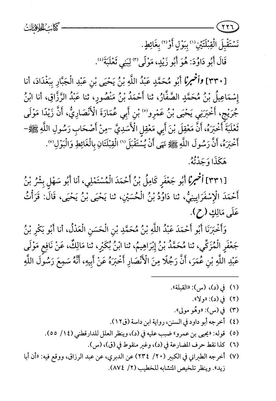 [330] وأخبرنا أَبُو مُحَمَّدٍ عَبْدُ اللَّهِ بْنُ يَحْيَى بْنِ عَبْدِ الْجَبَّارِ بِبَغْدَادَ، أنا إِسْمَاعِيلُ بْنُ مُحَمَّدٍ الصَّفَّارُ، ثنا أَحْمَدُ بْنُ مَنْصُورٍ، ثنا عَبْدُ الرَّزَّاقِ، أنا ابْنُ جُرَيْجٍ، أَخْبَرَنِي يَحْيَى بْنُ عَمْرِو (¬5) بْنِ أَبِي عُمَارَةَ الْأَنْصَارِيُّ، أَنَّ زيدًا مَوْلَى ثَعْلَبَةَ أَخْبَرَهُ، أَنَّ مَعْقِلَ بْنَ أَبِي مَعْقِلٍ الْأَسَدِيَّ - مِنْ أَصْحَابِ رَسُولِ اللَّهِ - صلى الله عليه وسلم - أَخْبَرَهُ، أَنَّ رَسُولَ اللَّهِ - صلى الله عليه وسلم - نَهَى أَنْ يُسْتَقْبَلَ (¬6) الْقِبْلَتَانِ بِالْغَائِطِ وَالْبَوْلِ (¬7).