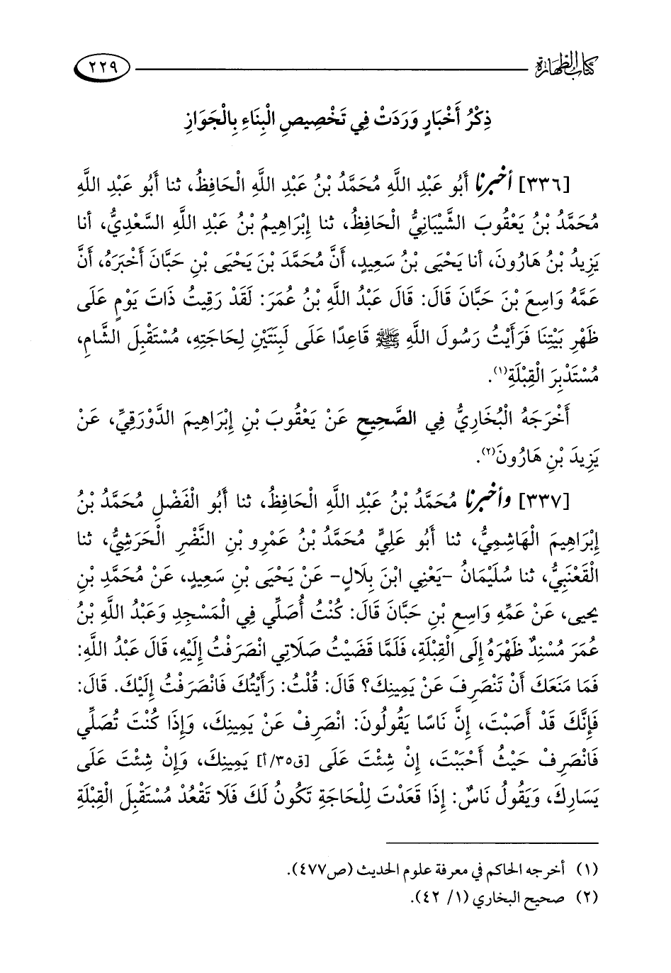 [336] أخبرنا أَبُو عَبْدِ اللَّهِ مُحَمَّدُ بْنُ عَبْدِ اللَّهِ الْحَافِظُ، ثنا أَبُو عَبْدِ اللَّهِ مُحَمَّدُ بْنُ يَعْقُوبَ الشَّيْبَانِيُّ الْحَافِظُ، ثنا إِبْرَاهِيمُ بْنُ عَبْدِ اللَّهِ السَّعْدِيُّ، أنا يَزِيدُ بْنُ هَارُونَ، أنا يَحْيَى بْنُ سَعِيدٍ، أَنَّ مُحَمَّدَ بْنَ يَحْيَى بْنِ حَبَّانَ أَخْبَرَهُ، أَنَّ عَمَّهُ وَاسِعَ بْنَ حَبَّانَ قَالَ: قَالَ عَبْدُ اللَّهِ بْنُ عُمَرَ: لَقَدْ رَقِيتُ ذَاتَ يَوْمٍ عَلَى ظَهْرِ بَيْتِنَا فَرَأَيْتُ رَسُولَ اللَّهِ - صلى الله عليه وسلم - قاعِدًا عَلَى لَبِنَتَيْنِ لِحَاجَتِهِ، مُسْتَقْبِلَ الشَّامِ، مُسْتَدْبِرَ الْقِبْلَةِ (¬1).