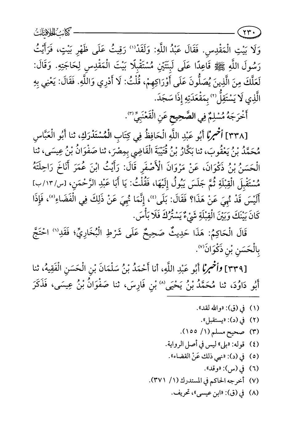 [338] أخبرنا أَبُو عَبْدِ اللَّهِ الْحَافِظُ فِي كِتَابِ الْمُسْتَدْرَكِ، ثنا أَبُو الْعَبَّاسِ مُحَمَّدُ بْنُ يَعْقُوبَ، ثنا بَكَّارُ بْنُ قُتَيْبَةَ الْقَاضِي بِمِصرَ، ثنا صَفْوَانُ بْنُ عِيسَى، ثنا الْحَسَنُ بْنُ ذَكْوَانَ، عَنْ مَرْوَانَ الْأَصْفَرِ قَالَ: رَأَيْتُ ابْنَ عُمَرَ أَنَاخَ رَاحِلَتَهُ مُسْتَقْبِلَ الْقِبْلَةِ ثُمَّ جَلَسَ يَبُولُ إِلَيْهَا، فَقُلْتُ: يَا أَبَا عَبْدِ الرَّحْمَنِ، أَلَيْسَ قَدْ نُهِيَ عَنْ هَذَا؟ فَقَالَ: بَلَى (¬4)، إِنَّمَا نُهِيَ عَنْ ذَلِكَ فِي الْفَضَاءِ (¬5)، فَإِذَا كَانَ بَيْنَكَ وَبَيْنَ الْقِبْلَةِ شَيْءٌ يَسْتُرُكَ فَلَا بَأْسَ.