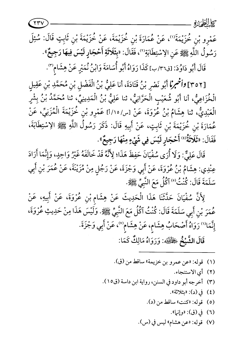 [352] وأخبرنا أَبُو نَصْرِ بْنُ قَتَادَةَ، أنا عَلِيُّ بْنُ الْفَضْلِ بْنِ مُحَمَّدِ بْنِ عَقِيلٍ الْخُزَاعِيُّ، أنا أَبُو شُعَيْبٍ الْحَرَّانِيُّ، ثنا عَلِيُّ بْنُ الْمَدِينِيِّ، ثنا مُحَمَّدُ بْنُ بِشْرٍ الْعَبْدِيُّ، ثنا هِشَامُ بْنُ عُرْوَةَ، عَنْ عَمْرِو بْنِ خُزَيْمَةَ الْمُزَنِيِّ، عَنْ عُمَارَةَ بْنِ خُزَيْمَةَ بْنِ ثَابِتٍ، عَنْ أَبِيهِ قَالَ: ذَكَرَ رَسُولُ اللَّهِ - صلى الله عليه وسلم - الِاسْتِطَابَةَ، فَقَالَ: "ثَلَاثَةُ (¬4) أَحْجَارٍ لَيْسَ فِي شَيْءٍ مِنْهَا رَجِيعٌ".