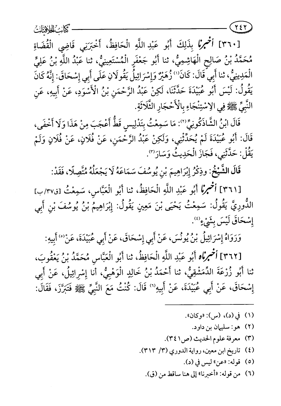 [360] أخبرنا بِذَلِكَ أَبُو عَبْدِ اللَّهِ الْحَافِظُ، أَخْبَرَنِي قَاضِي الْقُضَاةِ مُحَمَّدُ بْنُ صَالِحٍ الْهَاشِمِيُّ، ثنا أَبُو جَعْفَرٍ الْمُسْتَعِينِيُّ، ثنا عَبْدُ اللَّهِ بْنُ عَلِيٍّ الْمَدِينِيُّ، ثنا أَبِي قَالَ: كَانَ (¬1) زُهَيْرٌ وَإِسْرَائِيلُ يَقُولَانِ عَلَى أَبِي إِسْحَاقَ: إِنَّهُ كَانَ يَقُولُ: لَيْسَ أَبُو عُبَيْدَةَ حَدَّثَنَا، لَكِنْ عَبْدُ الرَّحْمَنِ بْنُ الْأَسْوَدِ، عَنْ أَبِيهِ، عَنِ النَّبِيِّ - صلى الله عليه وسلم - فِي الِاسْتِنْجَاءِ بِالْأَحْجَارِ الثَّلَاثَةِ.