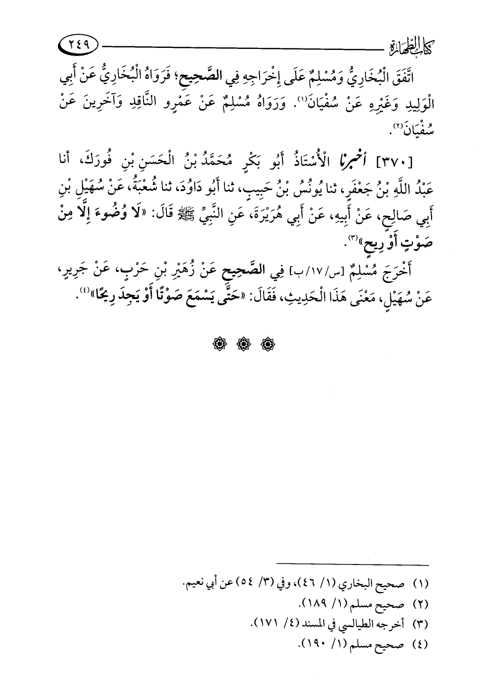 [370] أخبرنا الْأُسْتَاذُ أَبُو بَكْرٍ مُحَمَّدُ بْنُ الْحَسَنِ بْنِ فُورَكَ، أنا عَبْدُ اللَّهِ بْنُ جَعْفَرٍ، ثنا يُونُسُ بْنُ حَبِيبٍ، ثنا أَبُو دَاوُدَ، ثنا شُعْبَةُ، عَنْ سُهَيْلِ بْنِ أَبِي صَالِحٍ، عَنْ أَبِيهِ، عَنْ أَبِي هُرَيْرَةَ، عَنِ النَّبِيِّ - صلى الله عليه وسلم - قَالَ: "لَا وُضُوءَ إِلَّا مِنْ صَوْتٍ أَوْ رِيحٍ" (¬3).
