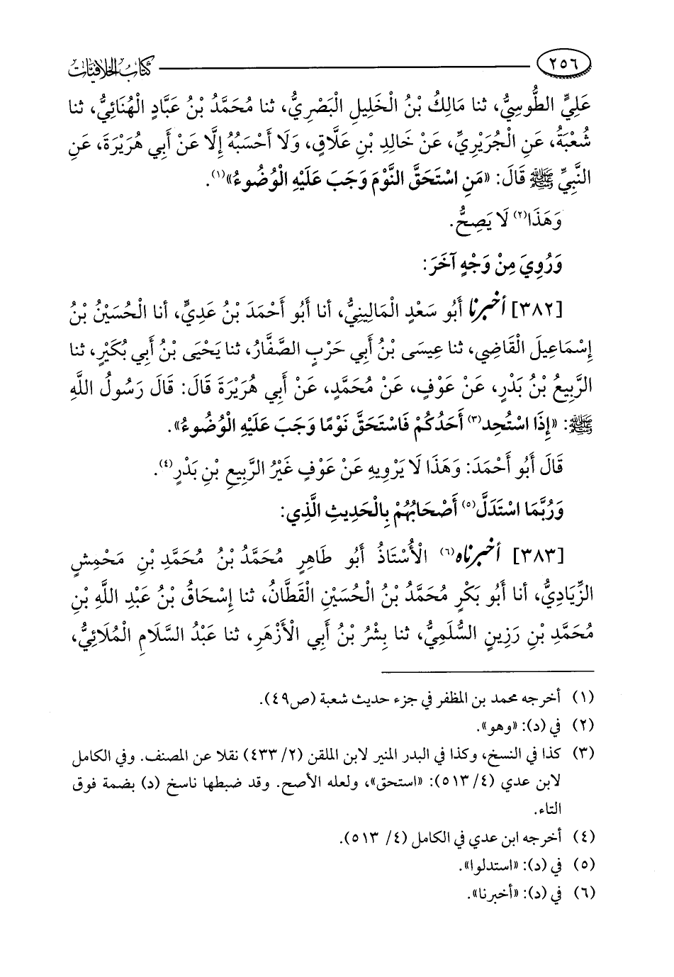 عَلِيٍّ الطُّوسِيُّ، ثنا مَالِكُ بْنُ الْخَلِيلِ الْبَصْرِيُّ، ثنا مُحَمَّدُ بْنُ عَبَّادٍ الْهُنَائِيُّ، ثنا شُعْبَةُ، عَنِ الْجُرَيْرِيِّ، عَنْ خَالِدِ بْنِ عَلَّاقٍ، وَلَا أَحْسَبُهُ إِلَّا عَنْ أَبِي هُرَيْرَةَ، عَنِ النَّبِيِّ - صلى الله عليه وسلم - قَالَ: "مَنِ اسْتَحَقَّ النَّوْمَ وَجَبَ عَلَيْهِ الْوُضُوءُ" (¬1).