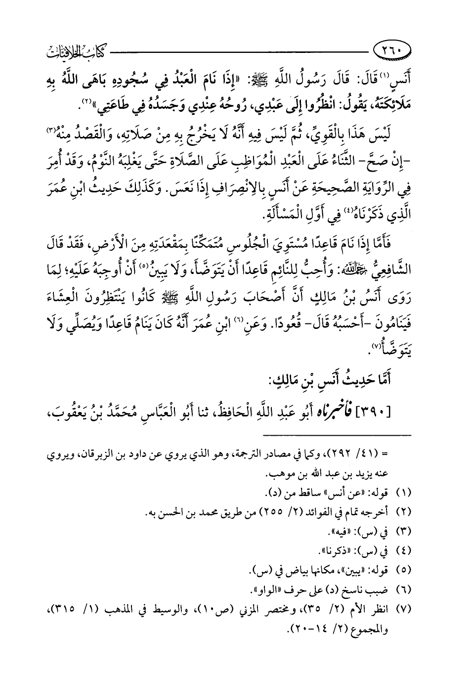 أَنَسٍ (¬1) قَالَ: قَالَ رَسُولُ اللَّهِ - صلى الله عليه وسلم -: "إِذَا نَامَ الْعَبْدُ فِي سُجُودِهِ بَاهَى اللَّهُ بِهِ مَلَائِكَتَهُ، يَقُوُل: انْظُرُوا إِلَى عَبْدِي، رُوحُهُ عِنْدِي وَجَسَدُهُ فِي طَاعَتِي" (¬2).