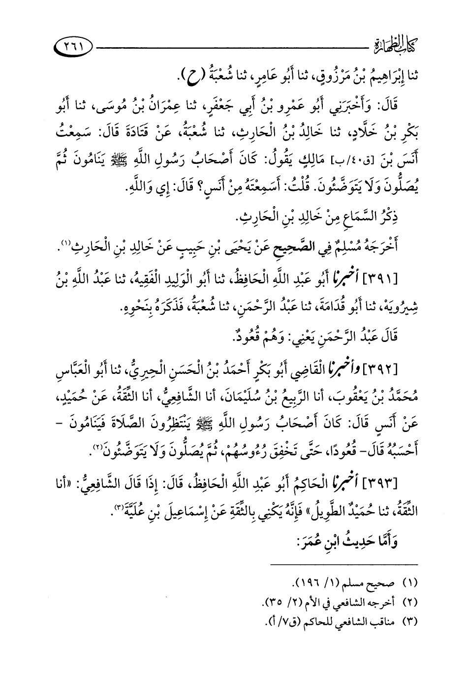 [392] وأخبرنا الْقَاضِي أَبُو بَكْرٍ أَحْمَدُ بْنُ الْحَسَنِ الْحِيرِيُّ، ثنا أَبُو الْعَبَّاسِ مُحَمَّدُ بْنُ يَعْقُوبَ، أنا الرَّبِيعُ بْنُ سُلَيْمَانَ، أنا الشَّافِعِيُّ، أنا الثِّقَةُ، عَنْ حُمَيْدٍ، عَنْ أَنَسٍ قَالَ: كَانَ أَصْحَابُ رَسُولِ اللَّهِ - صلى الله عليه وسلم - يَنْتَظِرُونَ الصَّلَاةَ فَيَنَامُونَ - أَحْسَبُهُ قَالَ - قُعُودًا، حَتَّى تَخْفِقَ رُءُوسُهُمْ، ثُمَّ يُصَلُّونَ وَلَا يَتَوَضَّئُونَ (¬2).