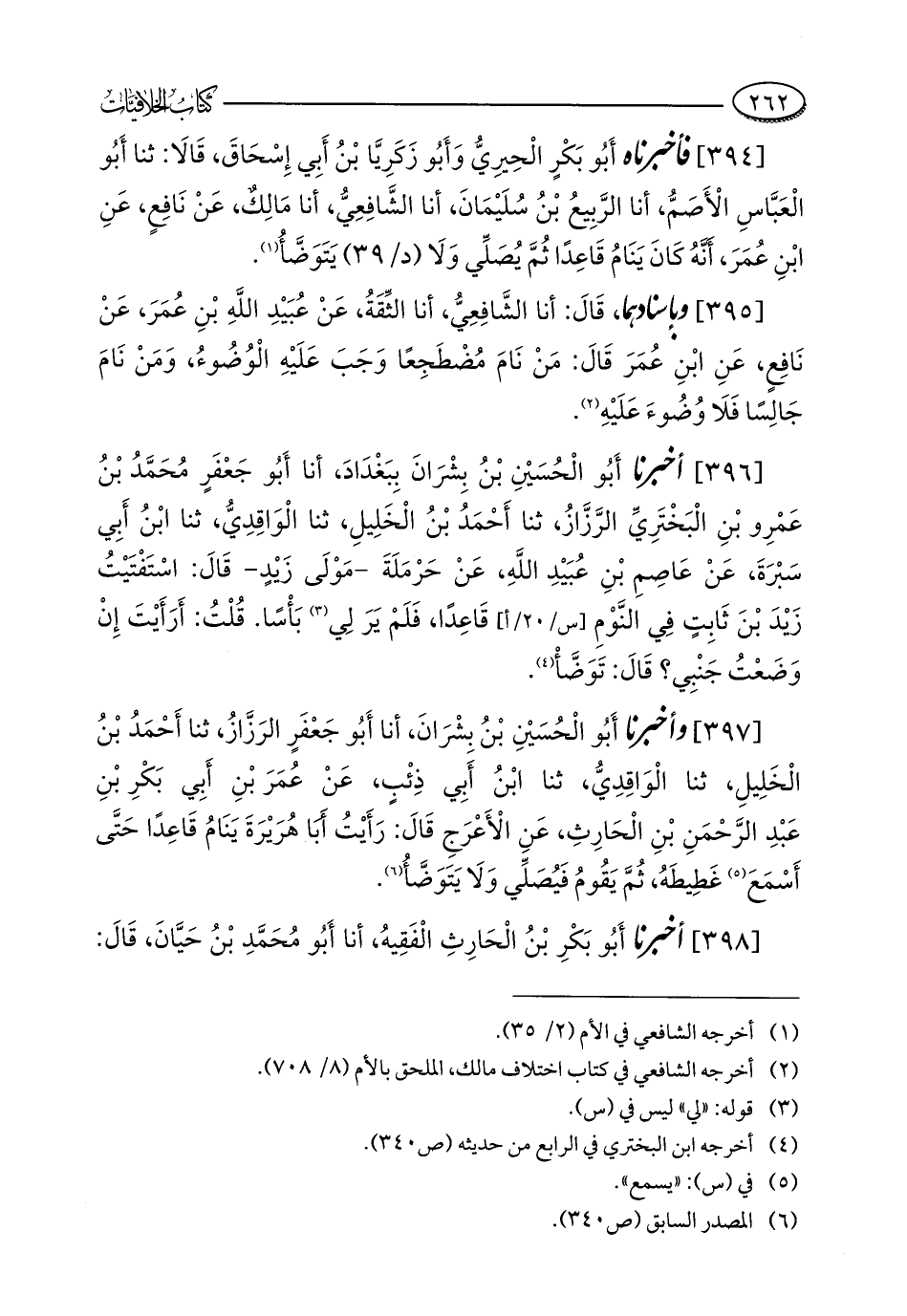 [394] فأخبرناه أَبُو بَكْرٍ الْحِيرِيُّ وَأَبُو زَكَرِيَّا بْنُ أَبِي إِسْحَاقَ، قَالَا: ثنا أَبُو الْعَبَّاسِ الْأَصَمُّ، أنا الرَّبِيعُ بْنُ سُلَيْمَانَ، أنا الشَّافِعِيُّ، أنا مَالِكٌ، عَنْ نَافِعٍ، عَنِ ابْنِ عُمَرَ، أَنَّهُ كَانَ يَنَامُ قَاعِدًا ثُمَّ يُصَلِّي وَلَا يَتَوَضَّأُ (¬1).