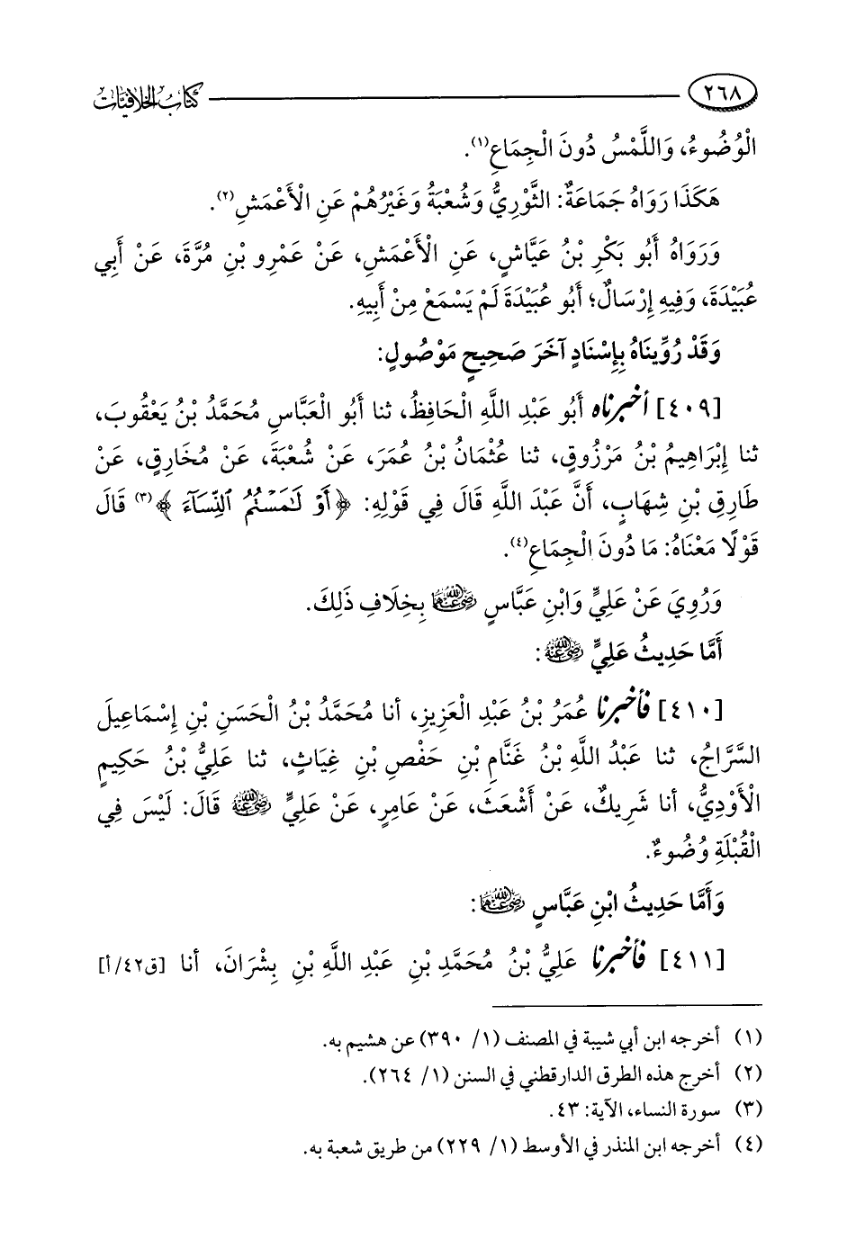 [410] فأخبرنا عُمَرُ بْنُ عَبْدِ الْعَزِيزِ، أنا مُحَمَّدُ بْنُ الْحَسَنِ بْنِ إِسْمَاعِيلَ السَّرَّاجُ، ثنا عَبْدُ اللَّهِ بْنُ غَنَّامِ بْنِ حَفْصِ بْنِ غِيَاثٍ، ثنا عَلِيُّ بْنُ حَكِيمٍ الْأَوْدِيُّ، أنا شَرِيكٌ، عَنْ أَشْعَثَ، عَنْ عَامِرٍ، عَنْ عَلِيٍّ - رضي الله عنه - قَالَ: لَيْسَ فِي الْقُبْلَةِ وُضُوءٌ.