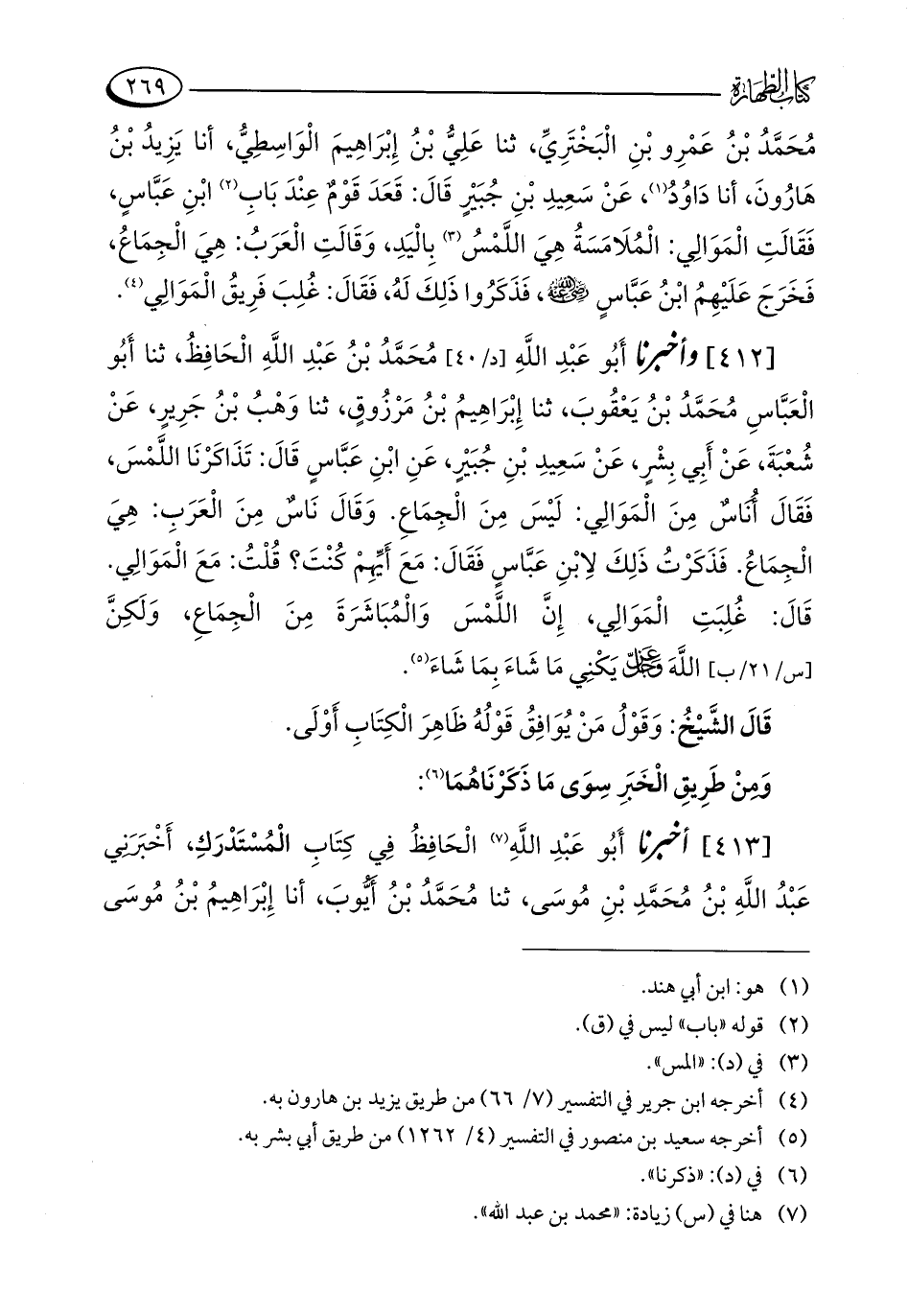 [412] وأخبرنا أَبُو عَبْدِ اللَّهِ مُحَمَّدُ بْنُ عَبْدِ اللَّهِ الْحَافِظُ، ثنا أَبُو الْعَبَّاسِ مُحَمَّدُ بْنُ يَعْقُوبَ، ثنا إِبْرَاهِيمُ بْنُ مَرْزُوقٍ، ثنا وَهْبُ بْنُ جَرِيرٍ، عَنْ شُعْبَةَ، عَنْ أَبِي بِشْرٍ، عَنْ سَعِيدِ بْنِ جُبَيْرٍ، عَنِ ابْنِ عَبَّاسٍ قَالَ: تَذَاكَرْنَا اللَّمْسَ، فَقَالَ أُنَاسٌ مِنَ الْمَوَالِي: لَيْسَ مِنَ الْجِمَاعِ. وَقَالَ نَاسٌ مِنَ الْعَرَبِ: هِيَ الْجِمَاعُ. فَذَكَرْتُ ذَلِكَ لِابْنِ عَبَّاسٍ فَقَالَ: مَعَ أَيِّهِمْ كُنْتَ؟ قُلْتُ: مَعَ الْمَوَالِي. قَالَ: غُلِبَتِ الْمَوَالِي، إِنَّ اللَّمْسَ وَالْمُبَاشَرَةَ مِنَ الْجِمَاعِ، وَلَكِنَّ اللَّهَ - عز وجل - يَكْنِي مَا شَاءَ بِمَا شَاءَ (¬5).