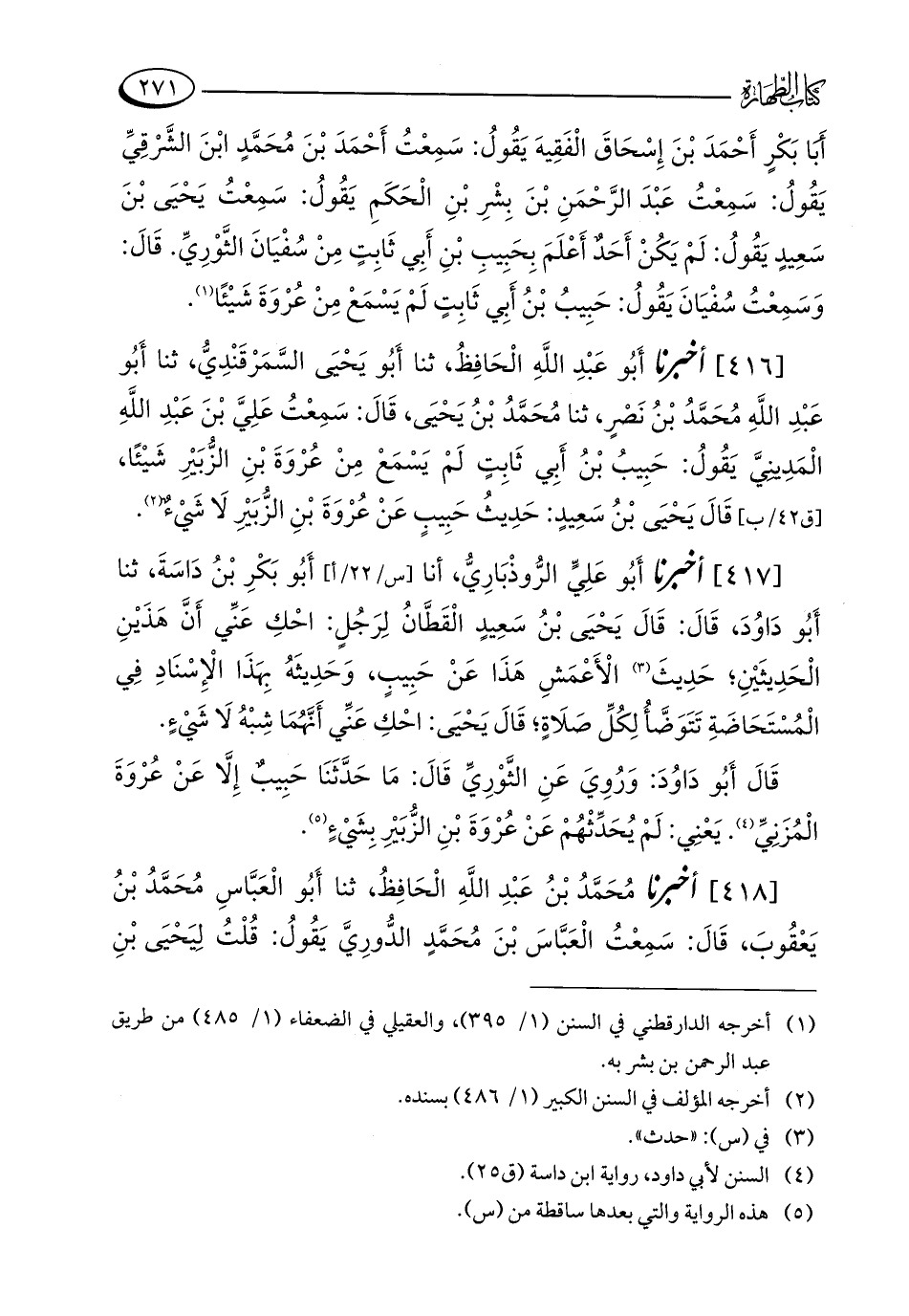 [417] أخبرنا أَبُو عَلِيٍّ الرُّوذْبَارِيُّ، أنا أَبُو بَكْرِ بْنُ دَاسَةَ، ثنا أَبُو دَاوُدَ، قَالَ: قَالَ يَحْيَى بْنُ سَعِيدٍ الْقَطَّانُ لِرَجُلٍ: احْكِ عَنِّي أَنَّ هَذَيْنِ الْحَدِيثَيْنِ؛ حَدِيثَ (¬3) الْأَعْمَشِ هَذَا عَنْ حَبِيبٍ، وَحَدِيثَهُ بِهَذَا الْإِسْنَادِ فِي الْمُسْتَحَاضَةِ تَتَوَضَّأُ لِكُلِّ صلَاةٍ؛ قَالَ يَحْيَى: احْكِ عَنِّي أَنَّهُمَا شِبْهُ لَا شَيْءٍ.