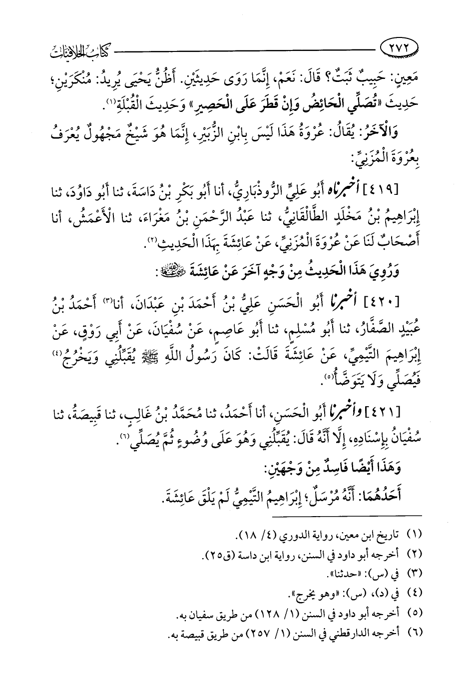 [420] أخبرنا أَبُو الْحَسَنِ عَلِيُّ بْنُ أَحْمَدَ بْنِ عَبْدَانَ، أنا (¬3) أَحْمَدُ بْنُ عُبَيْدٍ الصَّفَّارُ، ثنا أَبُو مُسْلِمٍ، ثنا أَبُو عَاصِمٍ، عَنْ سُفْيَانَ، عَنْ أَبِي رَوْقٍ، عَنْ إِبْرَاهِيمَ التَّيْمِيِّ، عَنْ عَائِشَةَ قَالَتْ: كَانَ رَسُولُ اللَّهِ - صلى الله عليه وسلم - يُقَبِّلُنِي وَيَخْرُجُ (¬4) فَيُصَلِّي وَلَا يَتَوَضَّأُ (¬5).