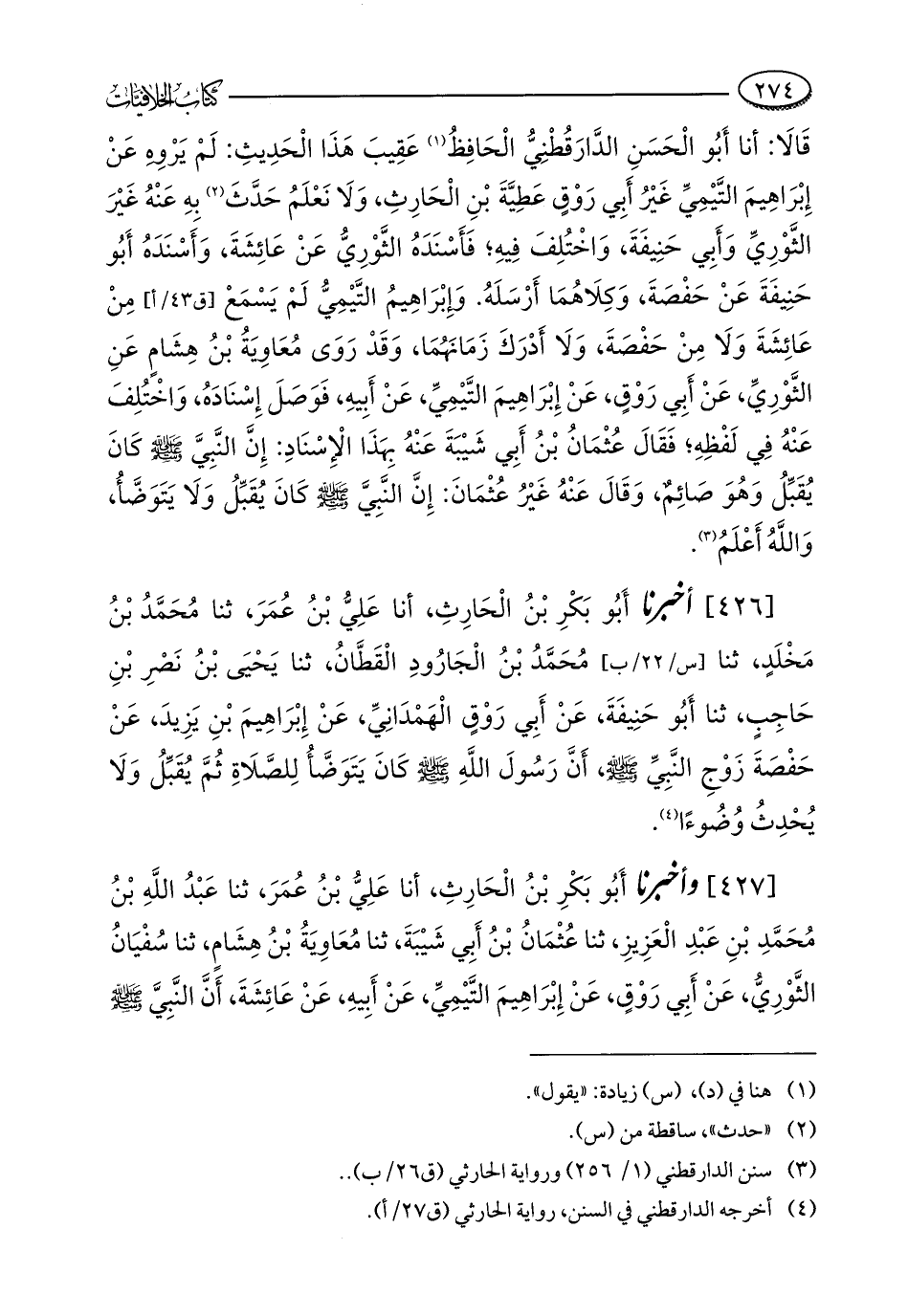 قَالَا: أنا أَبُو الْحَسَنِ الدَّارَقُطْنِيُّ الْحَافِظُ (¬1) عَقِيبَ هَذَا الْحَدِيثِ: لَمْ يَرْوِهِ عَنْ إِبْرَاهِيمَ التَّيْمِيِّ غَيْرُ أَبِي رَوْقٍ عَطِيَّةَ بْنِ الْحَارِثِ، وَلَا نَعْلَمُ حَدَّثَ (¬2) بِهِ عَنْهُ غَيْرَ الثَّوْرِيِّ وَأَبِي حَنِيفَةَ، وَاخْتُلِفَ فِيهِ؛ فَأَسْنَدَهُ الثَّوْرِيُّ عَنْ عَائِشَةَ، وَأَسْنَدَهُ أَبُو حَنِيفَةَ عَنْ حَفْصَةَ، وَكِلَاهُمَا أَرْسَلَهُ. وَإِبْرَاهِيمُ التَّيْمِيُّ لَمْ يَسْمَعْ مِنْ عَائِشَةَ وَلَا مِنْ حَفْصَةَ، وَلَا أَدْرَكَ زَمَانَهُمَا، وَقَدْ رَوَى مُعَاوِيَةُ بْنُ هِشَامٍ عَنِ الثَّوْرِيِّ، عَنْ أَبِي رَوْقٍ، عَنْ إِبْرَاهِيمَ التَّيْمِيِّ، عَنْ أَبِيهِ، فَوَصَلَ إِسْنَادَهُ، وَاخْتُلِفَ عَنْهُ فِي لَفْظِهِ؛ فَقَالَ عُثْمَانُ بْنُ أَبِي شَيْبَةَ عَنْهُ بِهَذَا الْإِسْنَادِ: إِنَّ النَّبِيَّ - صلى الله عليه وسلم - كانَ يُقَبِّلُ وَهُوَ صَائِمٌ، وَقَالَ عَنْهُ غَيْرُ عُثْمَانَ: إِنَّ النَّبِيَّ - صلى الله عليه وسلم - كَانَ يُقَبِّلُ وَلَا يَتَوَضَّأُ، وَاللَّهُ أَعْلَمُ (¬3).